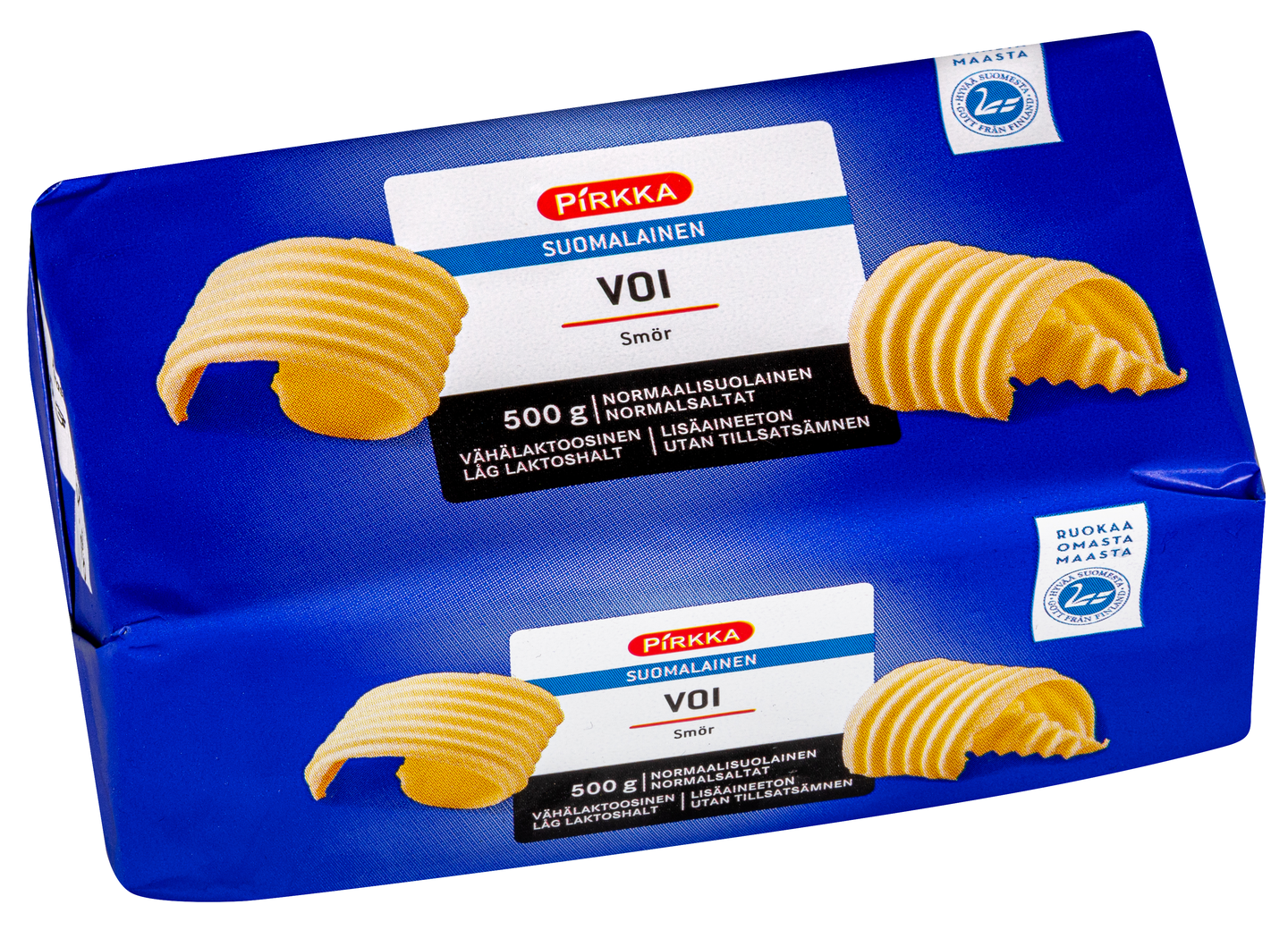 Pirkka voi leivälle, ruoanlaittoon ja leivontaan. Tuote on vähälaktoosinen ja lisäaineeton ja sillä on Hyvää Suomesta -merkki.