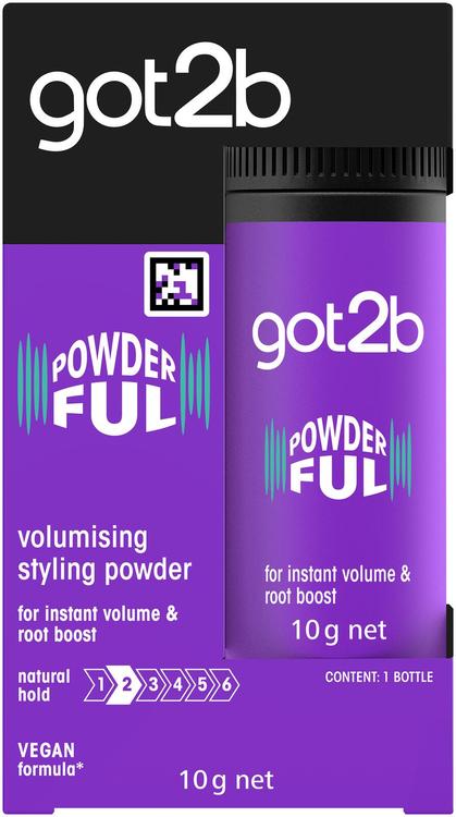 got2b Powderful Volumizing Styling Powder -hiuspuuteri antaa välittömästi volyymia hiuksiin! Hiuspuuteri kohottaa ja antaa hiuksille rakennetta tyvestä alkaen. Vegaaninen koostumus. Saat tuuheat hiukset ravistamalla puuteria kädellesi ja hieromalla käsiä yhteen. Hiero sen jälkeen tuotetta kuiviin hiuksiin aloittaen hiusten juuresta. Vielä enemmän tuuheutta saat ravistamalla tuotetta suoraan hiusten tyveen ja työstämällä kohti latvoja.