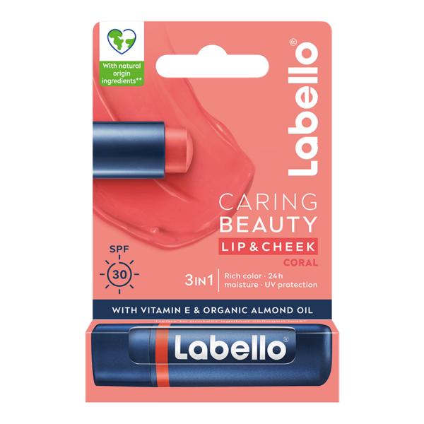 Labello Caring Beauty Coral - sävyttävä voide huulille ja poskille. Kosteuttaa huulia ja ihoa 24 tunnin ajan. Voidemainen koostumus antaa intensiivisen värin, käytä huulivoiteena, poskipunana tai molempina! 3in1-koostumus tarjoaa sävyn, hoitoa ja suojaa! Sisältää E-vitamiinia ja luonnollista manteiöljyä, joka ravitsee tehokkaasti huulia. Suojakerroin 30 suojaa ihoa UV-säteilyltä ja sen aiheuttamalta kollageenin vähenemiseltä. Tekee huulista ihanan pehmeät ja sileät ja ehkäisee niiden kuivumista. Voide on helppo levittää, kokeile myös kerrostaa yhdessä muiden Labello Caring Beauty -sävyjen kanssa ja luo ainutlaatuinen sävysi!