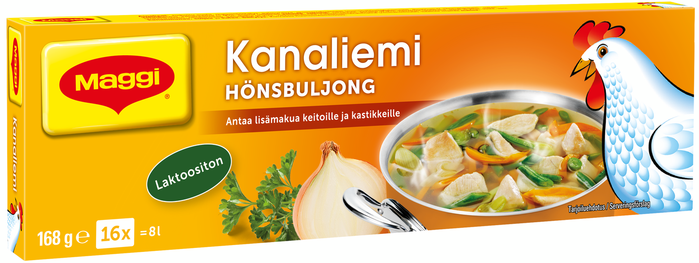 Perinteinen MAGGI Kanaliemi tuo lisää makua ruokiisi. Lisää kanaliemikuutio pastan tai riisin keitinveteen, keittoihin, patoihin tai kastikkeisiin kun haluat tehdä ruoasta erityisen maistuvaa. Tuote on laktoositon.