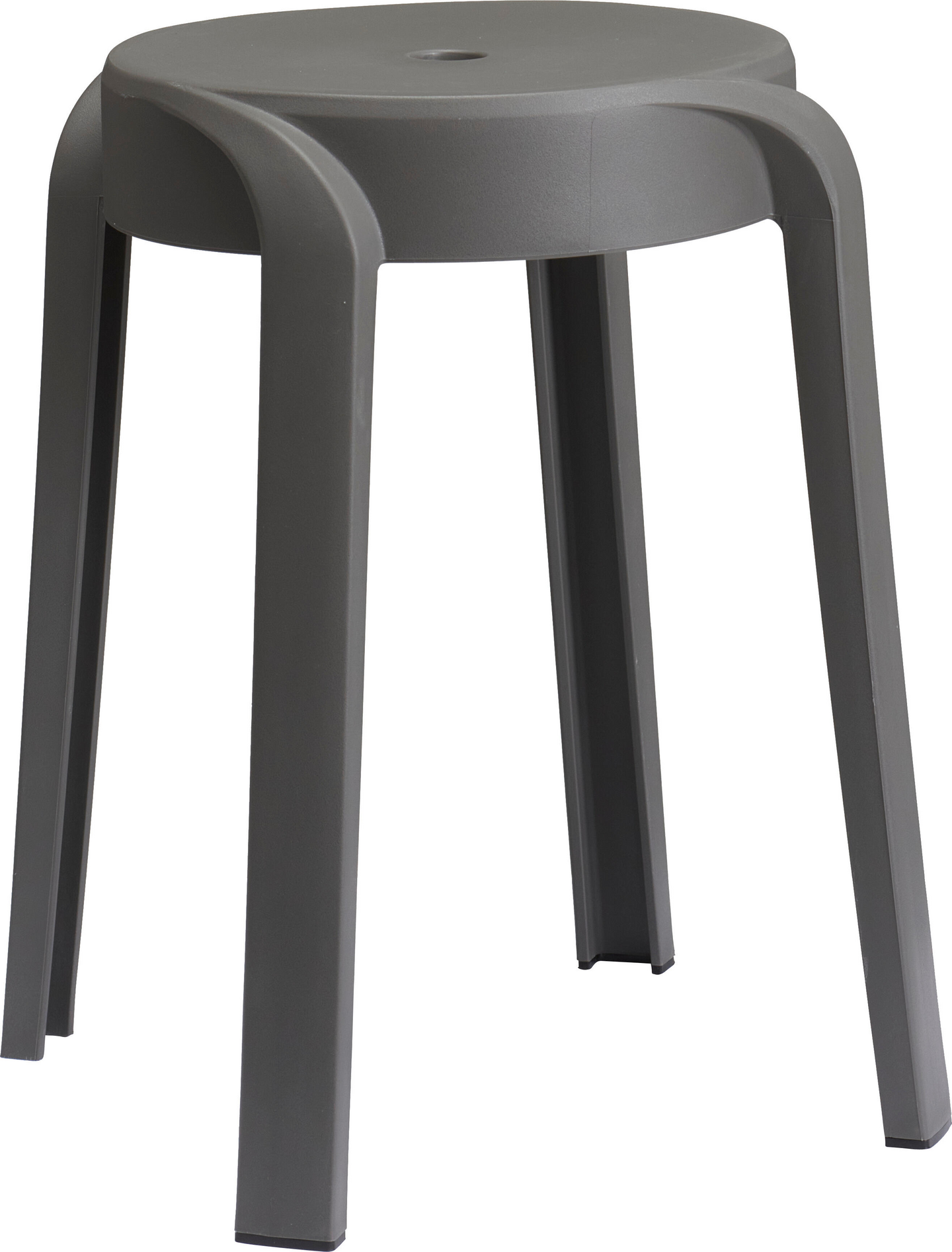 Kevyt ja UV-suojattu harmaa jakkara, joka pinoutuu helposti ja sopii sekä sisä- että ulkokäyttöön