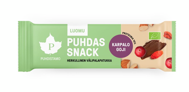 Puhdas Snack on laadukas välipalapatukka, joka on valmistettu ravitsevista luomusiemenistä ja -marjoista. Patukka on makeutettu luomu agavesiirapilla, maustettu luomumarjoilla ja viimeistelty luomusuklaalla. Luonnollisen herkullinen välipala!