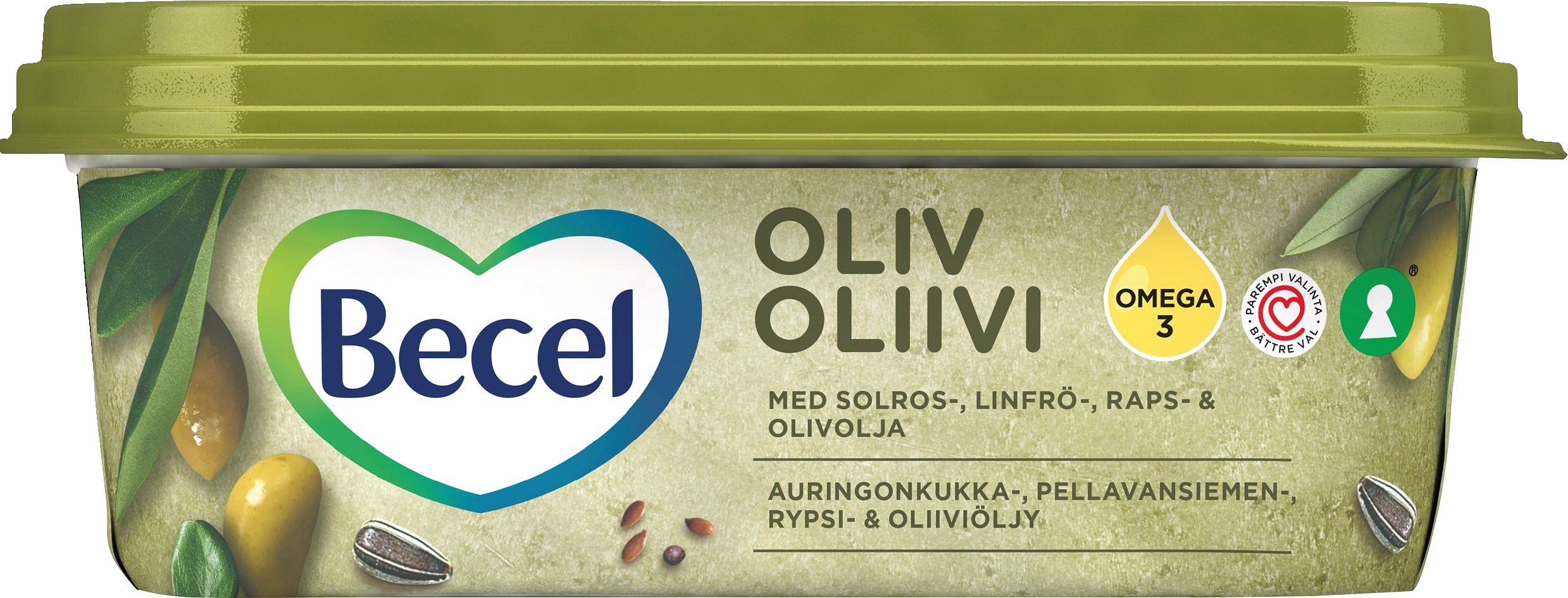 Becel Oliivi on valmistettu kasvipohjaisista öljyistä ja siinä on 8% oliiviöljyä. Se on hyvä omega-3 rasvahappojen sekä A ja D vitamiinin lähde. Tyydyttyneiden rasvojen korvaaminen tyydyttymättömillä rasvoilla ruokavaliossa edistää veren kolesterolitasojen pysymistä normaalina.