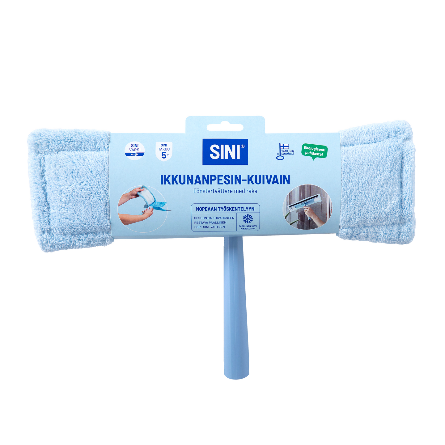 Ikkunanpesin-kuivain on kätevä yhdistelmä, jolla saa pestyä ja kuivattua ikkunat ja muut lasipinnat välineitä vaihtamatta. Ikkunanpesin-kuivain sopii Sini-jatkovarsiin. Ikkunanpesin-kuivain on kätevä yhdistelmä, jossa on tehokkaasti puhdistava ikkunanpesin sekä kuivauslasta samassa. Ikkunanpesin-kuivain sopii kaikkien ikkunoiden ja peilien pesuun ja toimii erinomaisesti myös ulkona esim. parvekelasien pesussa. Pesimen leveä mikrokuituinen päällinen kiinnitetään helposti kuminauhoilla, jotka pitävät sen pesun aikana tiukasti paikoillaan. Päällisen voi käytön jälkeen pestä pesukoneessa puhtaaksi. Ikkunanpesin-kuivain sopii Sini-varteen, jolloin ikkunanpesu onnistuu kätevästi korkeammaltakin ilman tikkaita. Kotimainen Avainlipputuote. Tuotteella on viiden vuoden Sini-takuu. Käyttöohje: Kastele pesin ja purista siitä ylimääräinen vesi pois. Pese ikkuna ikkunanpesuun sopivalla pesuaineella. Käännä tämän jälkeen kuivaimen puolelle ja kuivaa ikkuna yhdensuuntaisin tasaisin vedoin. Jos pesimestä roiskuu vettä kuivatessa, purista sitä vielä kuivemmaksi. Ikkunanpesin/kuivaimen voi liittää kaikkiin Sini-välinevarsiin, jolloin yletyt turvallisesti korkeisiinkin ikkunoihin. Hoito-ohje: Huuhtele huolellisesti ja kuivata ilmavasti. Mikrokuitupäällisen voi pestä pesukoneessa pesupussissa 60 asteessa. Säilytä Ikkunanpesin-kuivain mieluiten ripustettuna, jotta sen kumiosa ei vahingoitu. Materiaali: Pesin-kuivain runko – polypropeeni Kuivain lista – alumiini Kuivain kumi – tpe Pesinosa – mikrokuitu Kierrätysohje: Ikkunanpesin-kuivain – energiajäte Kumi – energiajäte Kumin lista – keräysmetalli Mikrokuitupesin – energiajäte Pakkauspahvi – keräyspahvi