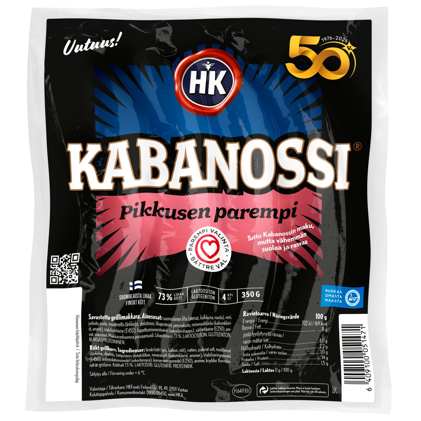 HK Kabanossi® on lupaus lihaisasta grillimakkarasta, todellinen grillauksen klassikko. Pikkusen parempi HK Kabanossi® on nappivalinta, kun etsit herkullista grillimakkaraa, jossa on vähemmän suolaa ja rasvaa. Tuotteen maussa ei ole kuitenkaan tingitty tuumaakaan. Sydänmerkki kertoo, että makkara on tuoteryhmässään rasvan ja suolan kannalta parempi valinta. Nauti grillattuna tai muussa ruuanlaitossa. Lajittele pakkaus käytön jälkeen muovina.