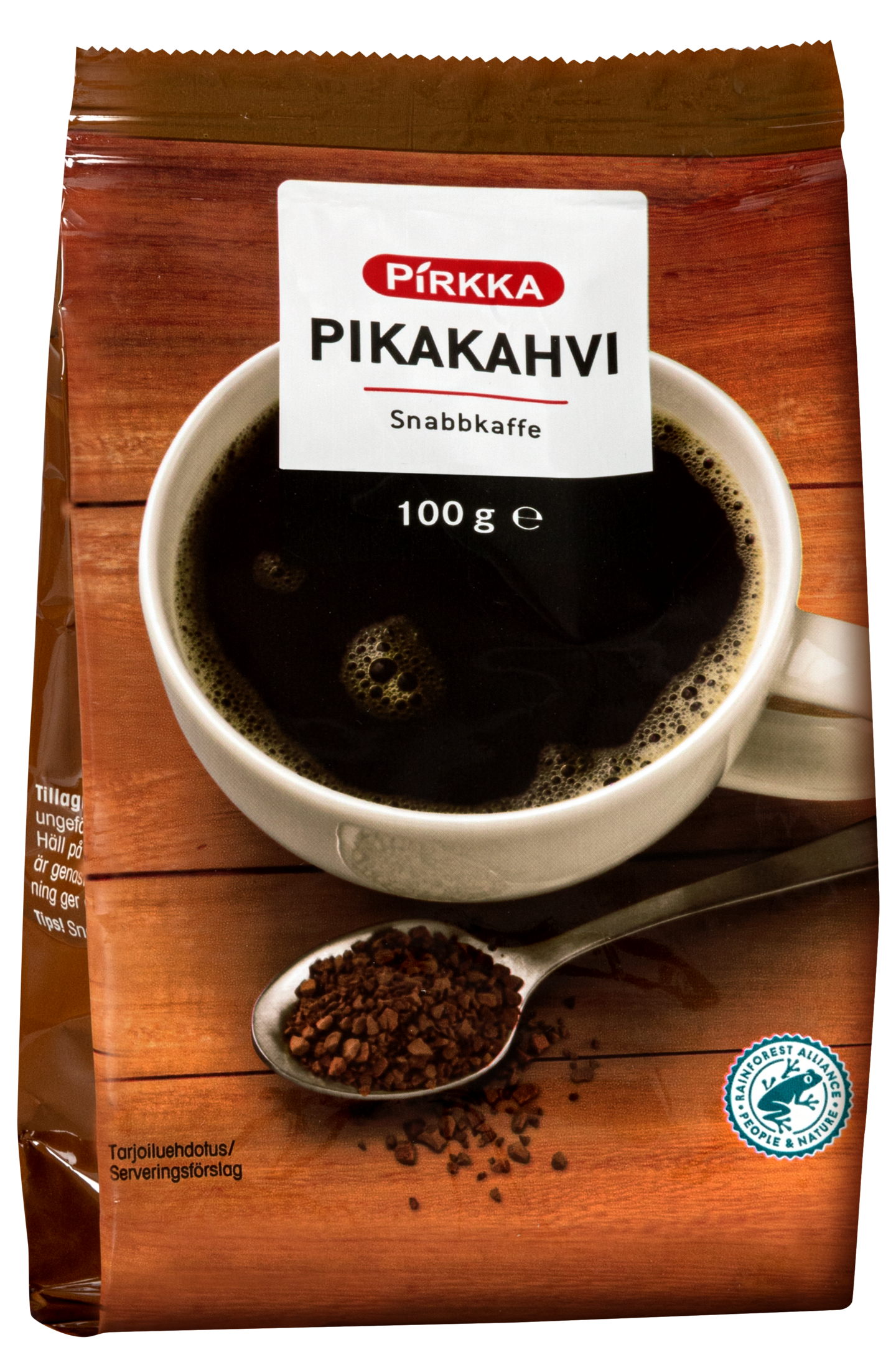 Pirkka pikakahvi on helppo ja nopea tapa valmistaa täyteläisen hyvää kahvia. Varaa maun mukaan 1-2 teelusikallista pikakahvia kuppia kohden. Lisää vain kuuma vesi ja kahvi on valmista. Voit valmistaa kahvin myös kuumaan tai kylmään maitoon tai kaurajuomaan ja maustaa makusi mukaan, tai valmistaa näyttävän Dalgona-kahvijuoman. Pikakahvi on helppo ottaa mukaan esimerkiksi mökille, veneeseen tai retkelle ja se sopii myös leivontaan. Pirkka pikakahvi on Rainforest Alliance -sertifioitua ja medium roast eli keskipaahdettua.