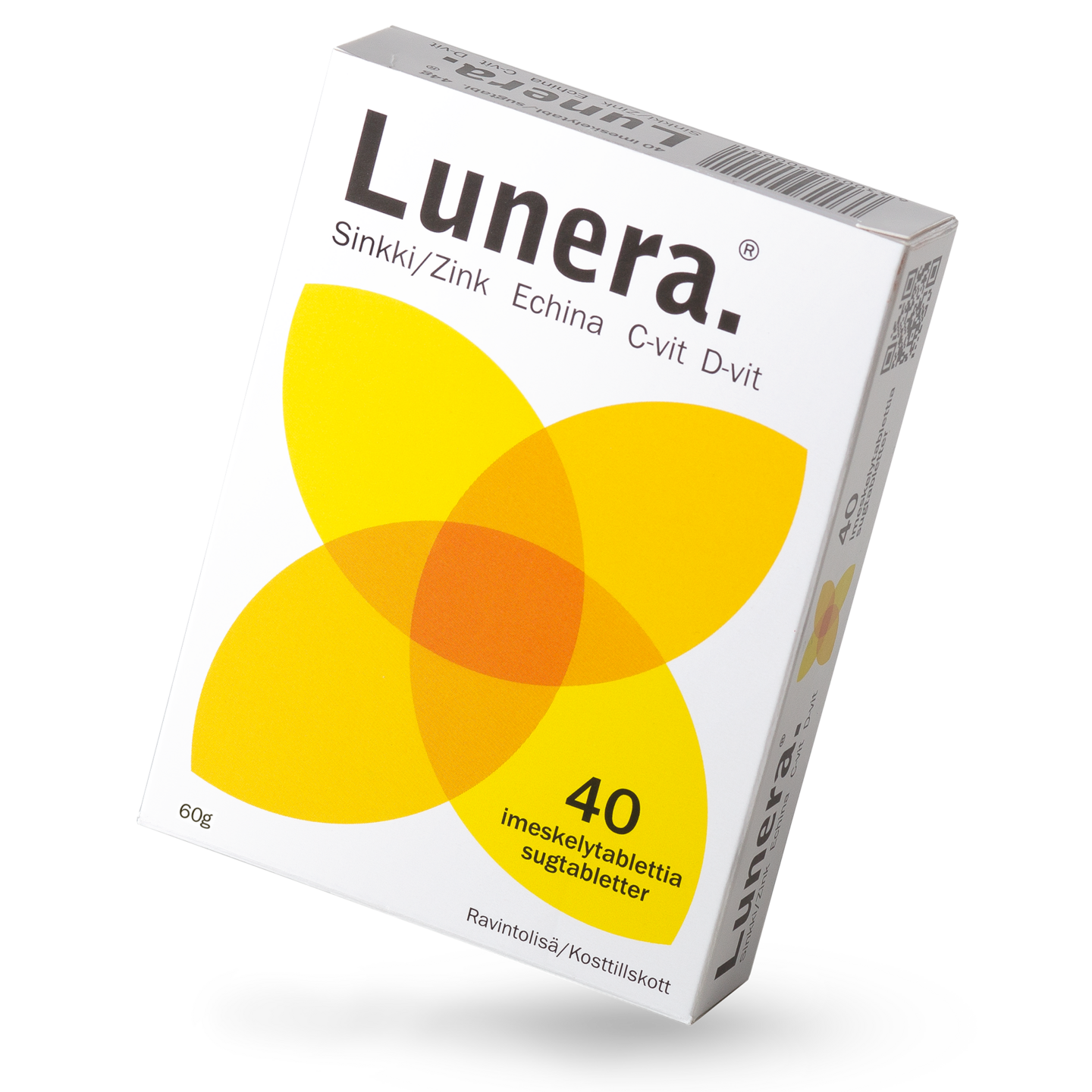 Lunera-imeskelytabletit sisältävät sinkkiä, auringonhattu-uutetta sekä runsaasti C- ja D-vitamiineja, jotka edistävät elimistön immunijärjestelmän normaalia toimintaa. C-vitamiini auttaa vähentämään väsymystä ja uupumusta. Auringonhattu-uute lievittää kurkun ärsytystä. Makeutettu mannitolilla, ksylitolilla ja sukraloosilla. Laktoositon ja gluteeniton.