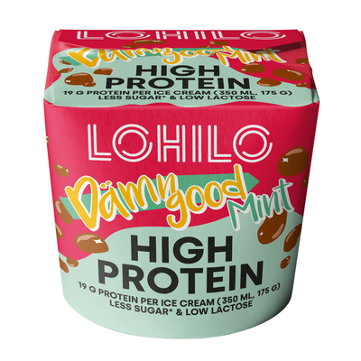 Minttuproteiinijäätelöä karamellipaloilla ja suklaakuorrutteella, vähälaktoosinen. Lohilo proteiinijäätelöt sopivat niin välipalaksi kuin herkutteluunkin. Vähemmän sokeria, enemmän proteiinia, herkullisesta mausta ja pehmeästä koostumuksesta tinkimättä.