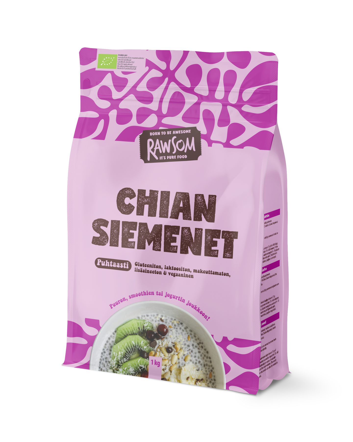 Luomu Rawsom Chian siemenet sisältävät mm. terveellisiä omega-3-rasvahappoja, ravintokuitua ja proteiinia. Sopivat erinomaisesti smoothien, jogurtin ja myslin sekaan. Gluteeniton, laktoositon, lisäaineeton.