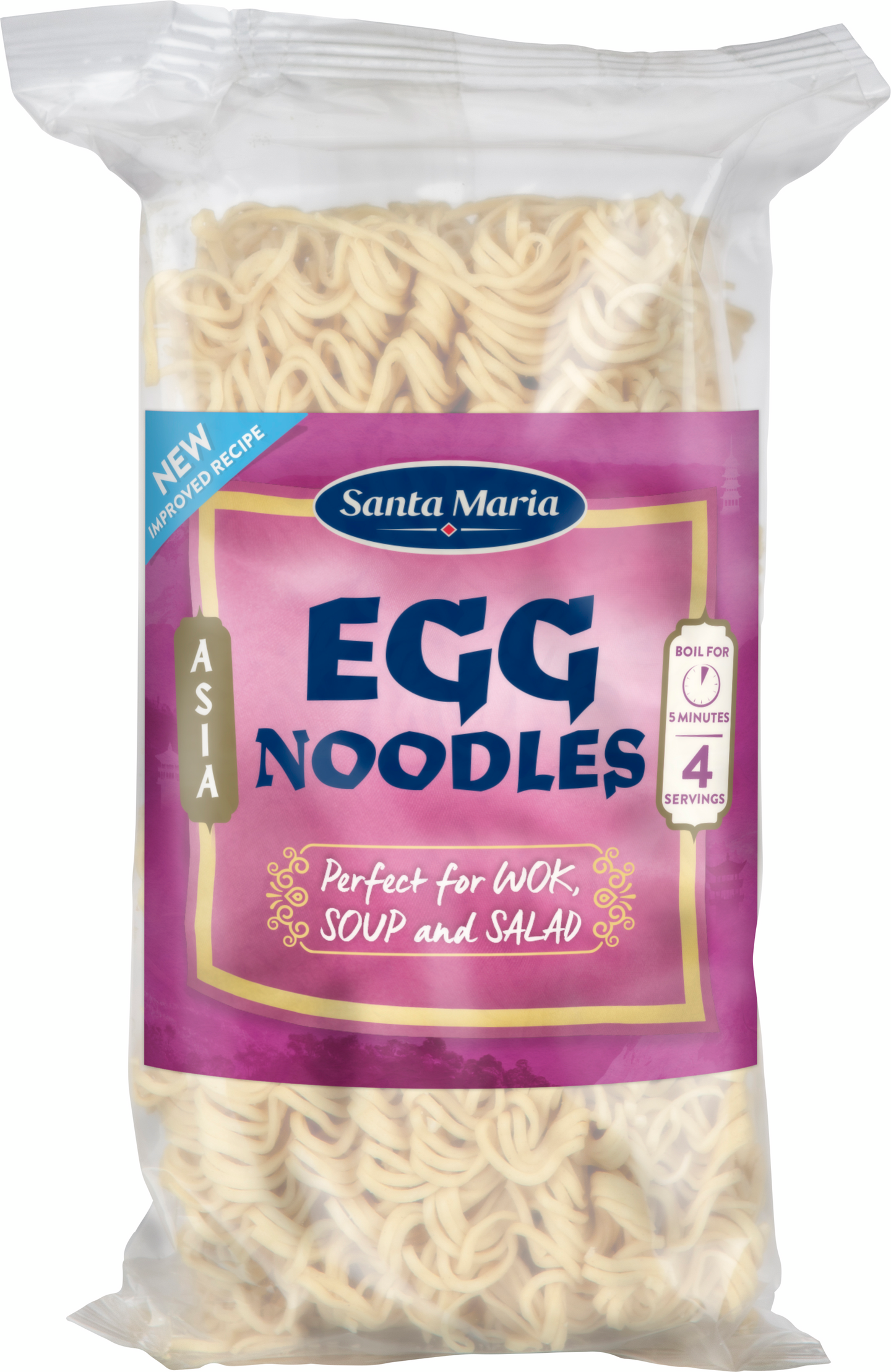 Aaltomaisesti muotoillut munanuudelit, jotka kestävät korkeita lämpötiloja, ja sopivat useimpiin nuudeliresepteihin: wokkeihin, keittoihin ja salaatteihin. Aaltomainen muoto ja kiinteä rakenne auttavat lisäämään kosketuspintaa kastikkeen ja mausteiden kanssa, jolloin ne sekoittuvat hyvin muiden ainesosien kanssa. Yksinkertainen valmistusmenetelmä ja koostumus joka ei ole tahmea: Santa Marian munanuudelit on suunniteltu helppoon valmistukseen, joten voit luottavaisesti luoda mitä tahansa aasialaisia nuudeliruokia ilman huolta nuudelien tarttumisesta tai paakkuuntumisesta. Jokainen pakkaus sisältää 4 annosta, joista yksi pesä vastaa yhtä annosta.