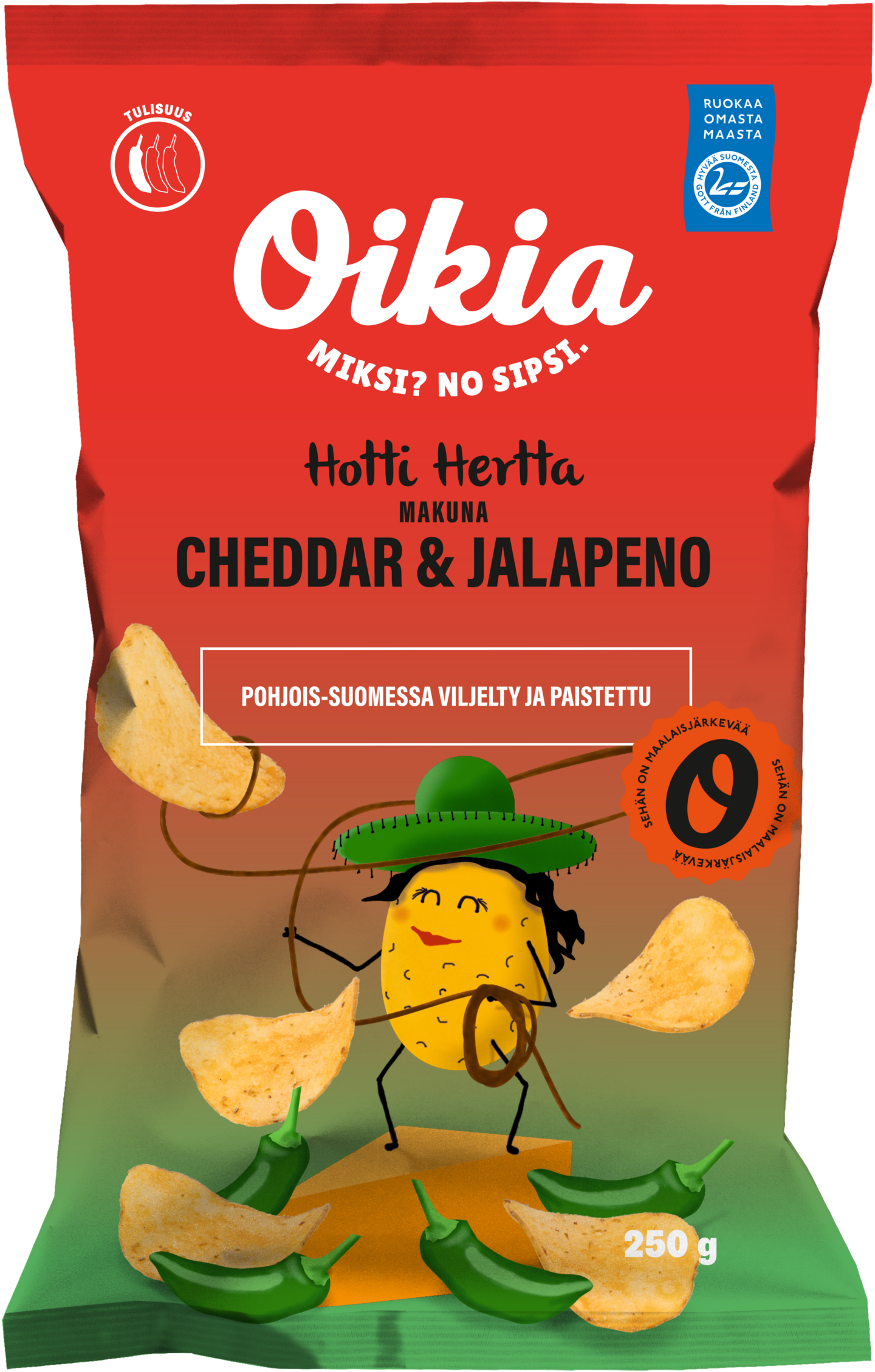 Oikia Hotti Hertta on cheddarin ja jalapenon makuinen sileä perunalastu, joka on pakattu kartonkikierrätettävään pussiin. Oikian sipsit valmistetaan Pyhännällä kotimaisista perunoista. Jos haluat tietää sipsiperunoiden viljelijän, kurkista pussin takapuolelle. Oikia sipsi on perunan herkullisimmaksi jalostunut muoto, rapsakka rauhanneuvottelija ja synkkyyden selättäjä. Ai miksi? No sipsi.