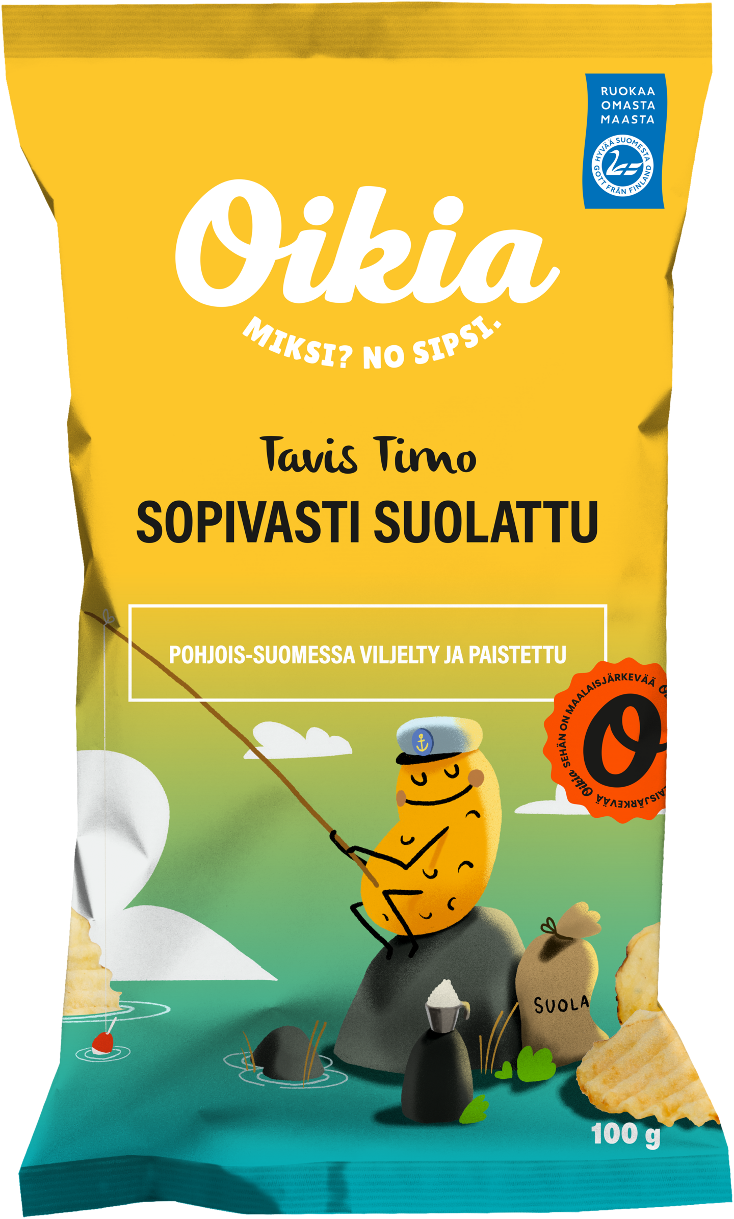 Oikian sipsit valmistetaan kotimaisista pohjoisen perunoista. Jokaisessa pakkauksessa kerrotaan, missä sen sisältämät sipsiperunat on viljelty. Jokainen pakkaus on valmistettu ympäristöystävällisesti, materiaaleja ja painovärejä myöten. Ja kun on kysymys itse sipsistä, Oikia tarkoittaa sitä, että parempaa herkkua ei maan päältä tai kaupan hyllyltä löydy. Sipsiin ei yksinkertaisesti voi suhtautua liian vakavasti tai riittävän kevyesti. Oikia sipsi on perunan herkullisimmaksi jalostunut muoto, rapsakka rauhanneuvottelija ja synkkyyden selättäjä. Me uskomme, että vastaus kaikkeen on sipsi. Ai miksi? No sipsi. Tavis Timo on kullanrapea ja perinteisen poimuisa perunalastu herkkuhetkiisi.