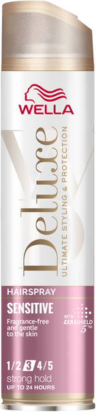 Wella Deluxe Sensitive hellävaraisessa hiuskiinteessä on käytetty hiustesi omaa keratiinia suojaavaa KERASHIEL 5 yhdistelmää, joka suojaa hiuksiasi viideltä tekijältä. 1. mekaaniselta rasitukselta 2. kuivumiselta 3. pörröisyydeltä 4. elottomuudelta 5. UV säteiltä. Lisäksi se on helppo kammata pois. Vahvaa pitoa jopa 24 h. Käyttö: Suihkuta 20-30 cm etäisyydeltä joko kaikkialle hiuksiin tai vain osaan hiuksista niiden korostamiseksi. Suihkuta hiusten tyveen ja muotoile hiuksiin näkyvää tuuheutta.
