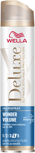 Wella Deluxe Wonder Volume hiuskiinteessä on käytetty hiustesi omaa keratiinia suojaavaa KERASHIEL 5 yhdistelmää, joka suojaa hiuksiasi viideltä tekijältä. 1. mekaaniselta rasitukselta 2. kuivumiselta 3. pörröisyydeltä 4. elottomuudelta 5. UV säteiltä. Lisäksi se on helppo kammata pois. Vahvaa pitoa jopa 24 h. Käyttö: Suihkuta 20-30 cm etäisyydeltä joko kaikkialle hiuksiin tai vain osaan hiuksista niiden korostamiseksi. Suihkuta hiusten tyveen ja muotoile hiuksiin näkyvää tuuheutta. Saatavana myös Wonder Volume muotovaahto matkakoko 75 ml.