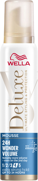 Wella Deluxe Wonder Volume muotovaahdossa on käytetty hiustesi omaa keratiinia suojaavaa KERASHIEL 5 yhdistelmää, joka suojaa hiuksiasi viideltä tekijältä. 1. mekaaniselta rasitukselta 2. kuivumiselta 3. pörröisyydeltä 4. elottomuudelta 5. UV säteiltä. Lisäksi se on helppo kammata pois. Vahvaa pitoa jopa 24 h. Käyttö: Ravista pulloa hyvin ennen käyttöä ja käännä se ylösalaisin. Käytä puolipitkille hiuksille omenan kokoinen määrä tuotetta ja levitä se tasaisesti kosteisiin hiuksiin. Föönää tai anna kuivua itsestään. Saatavana myös Wonder Volume hiuskiinne.