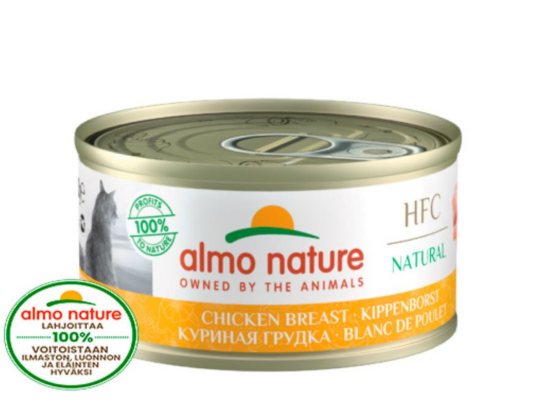täydennysravinto kaikenikäisille kissoille - paljon tuoretta lihaa: 60-75% laadukasta, tuoretta lihaa, joka on alun perin tarkoitettu ihmisravinnoksi - luonnollinen: kypsytetty ja säilötty hellävaroen omassa liemessään, erityisen maukas ja sulava - laadukas ravintoainekoostumus: lempeä valmistusprosessi, joka takaa arvokkaiden, luonnollisten ravinteiden säilymisen - gluteeniton: sopii myös ruoka-aineyliherkille kissoille - maistuvaa: suuren lihapitoisuuden ja mehukkaan, lajinmukaisen ja luonnollisen reseptin ansiosta - ei sisällä keinotekoisia lisäaineita, kuten maku-, väri- tai säilöntäaineita Almo Nature oli markkinoiden ensimmäinen täysin luonnollinen lemmikkieläinten ruoka. Laadukkaat raaka-aineet, joista tärkeimpänä liha tai kala, on huolella valittu ja hellävaraisesti valmistettu. Vuodesta 2018 alkaen 100% Almo Naturen voitoista on lahjoitettu luonnon hyväksi. Monipuolinen ruoka vaativillekin kissoille. Almo Nature sisältää paljon tuoreita liha- ja kalapaloja (vähintään 60 %), jotka on alun perin tarkoitettu ihmisravinnoksi. Gluteeniton ruoka on kypsytetty varovasti omassa liemessään, jolloin sen sisältämät proteiinit ja hivenaineet säilyvät luonnollisella tavalla. Näin ruoassa on arvokas ravintoainekoostumus, joka vastaa kissasi fysiologisia tarpeita. Valmistusmenetelmä takaa lisäksi hyvän sulavuuden ja parhaan maittavuuden. Jopa erityisen vaativat tai herkät kissat voivat löytää lempiruokansa! Kokonaisvaltainen, luonnollisesti puhdas ja maukas lisäravinto, joka ei sisällä keinotekoisia lisäaineita, kuten maku-, väri- tai säilöntäaineita.