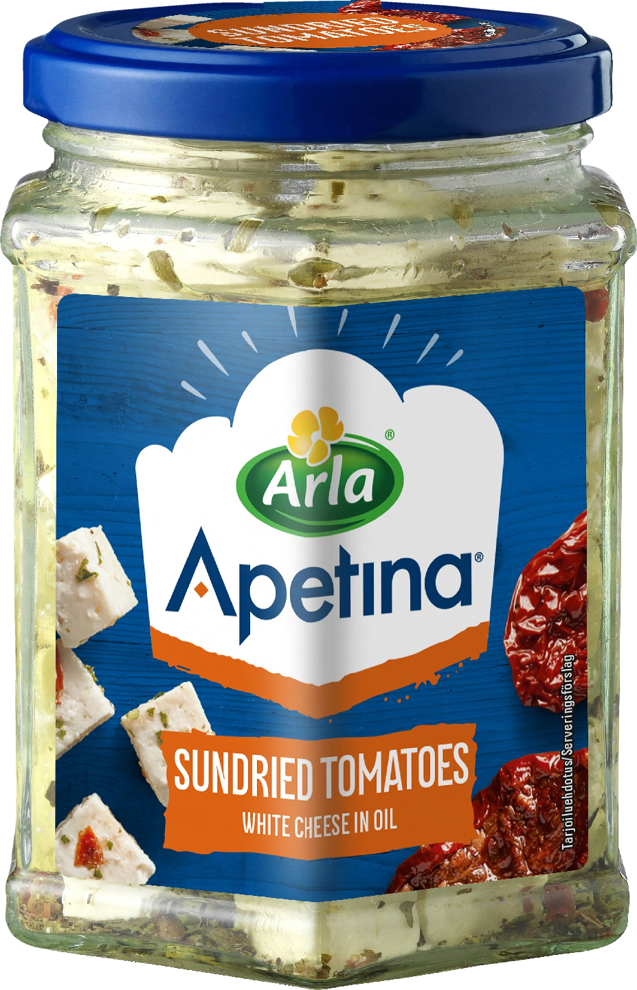 Salaattijuustokuutioita ja aurinkokuivattuja tomaatteja öljymarinadissa. Vähälaktoosinen.