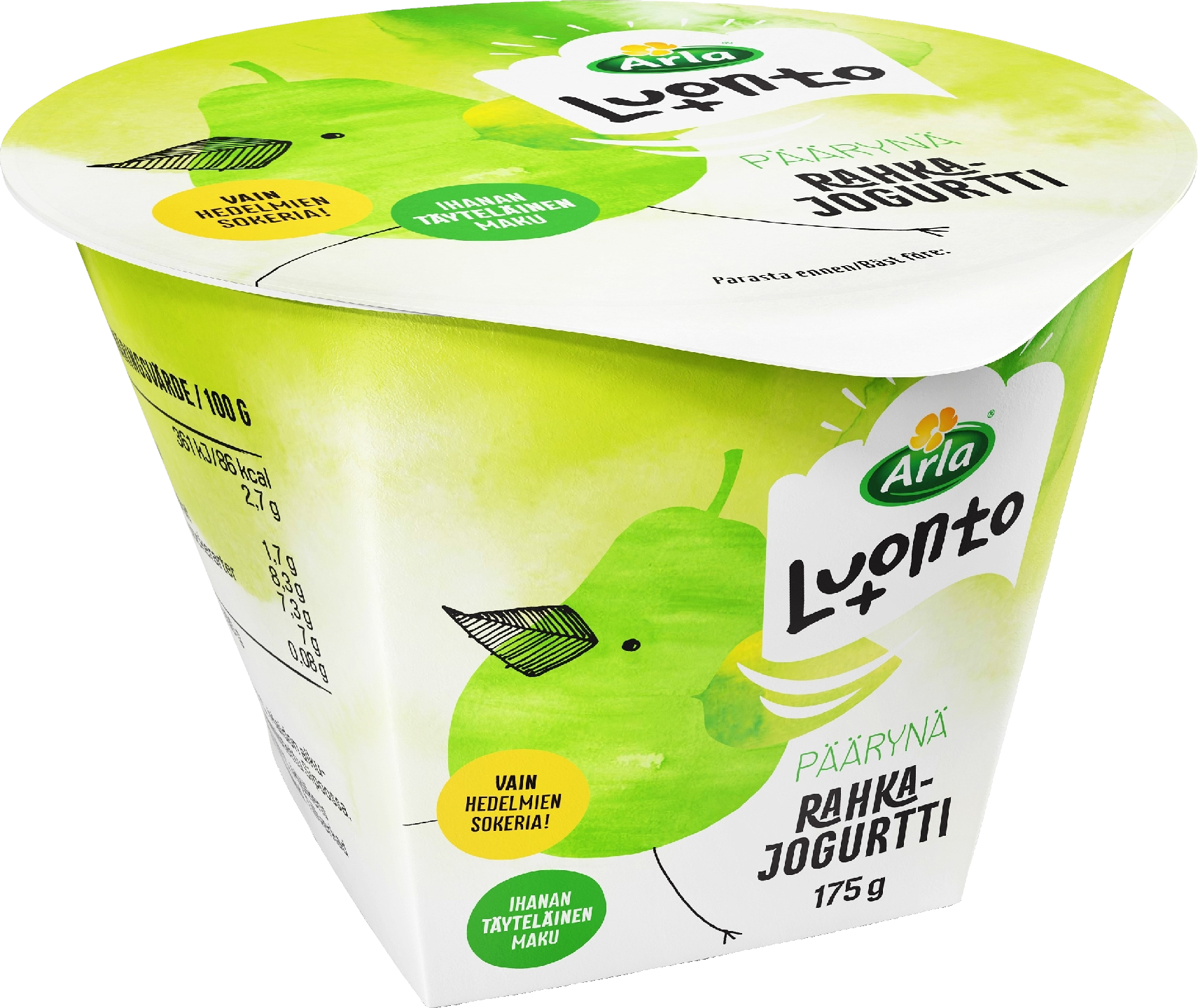 Löysit juuri uuden lempivälipalasi! Arla Luonto+ päärynärahkajogurtti on täynnä sallittua herkullisuutta. Ihanan raikas päärynä ja paksu rahkajogurtti - täydellinen välipala. Valmistettu 100% suomalaisesta maidosta, suoraan Sipoon meijeristä. Kylläisyyttä ylläpitävä välipala, joka ei ole liian makea.