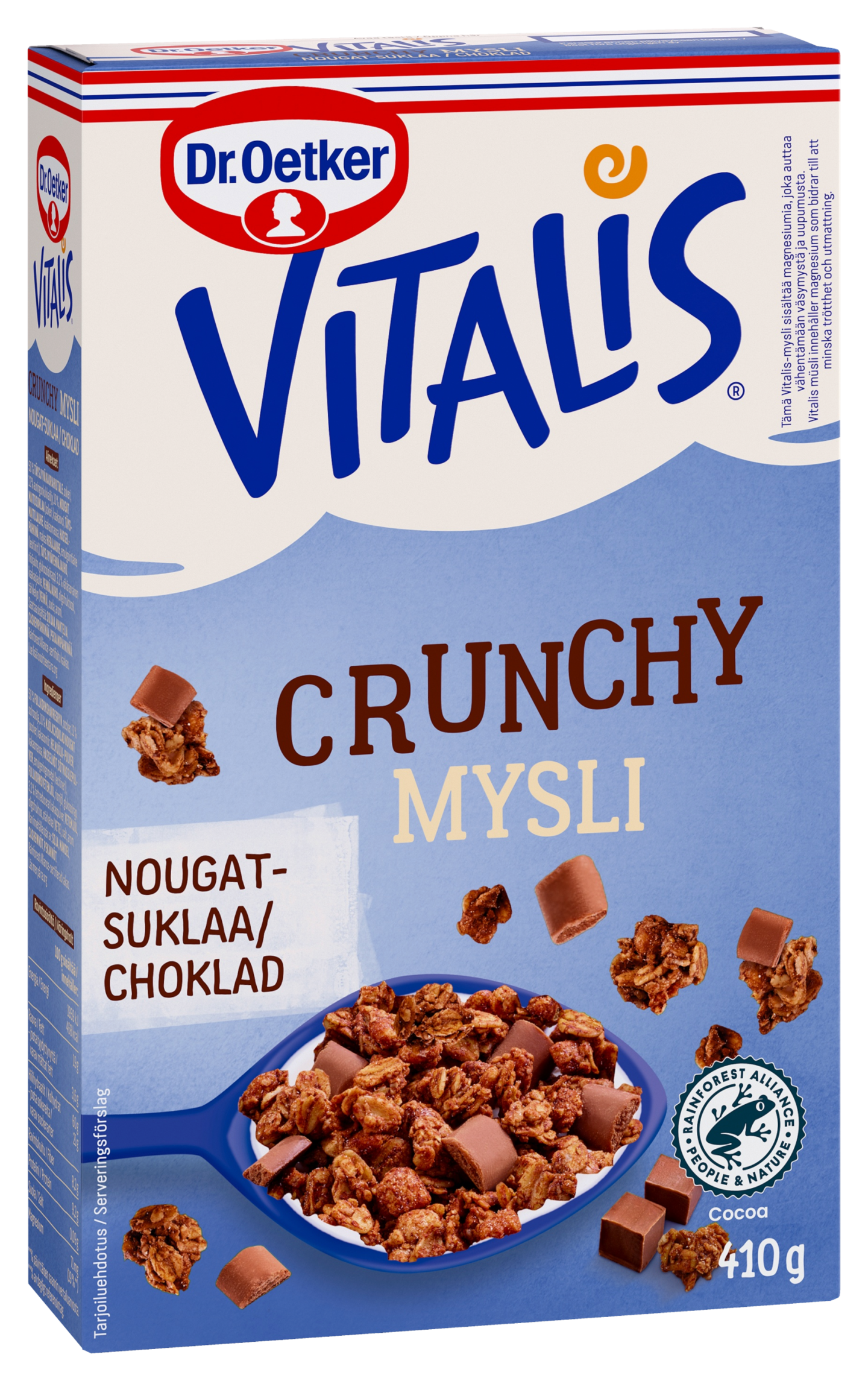 Dr. Oetker Vitalis Crunchy Nougat-suklaamysli tekee aamiaisesta erityisen. 50% Paahdettuja täysjyväkaurahiutaleita, hasselpähkinää sekä pehmeitä nougat-suklaapaloja vastuullisesti tuotetusta kaakaosta yhdistyvät vastustamattomaksi kokonaisuudeksi. Runsaskuituinen Crunchy-mysli sisältää magnesiumia. Täydellinen jogurtin, maidon tai kasvipohjaisten vaihtoehtojen kanssa.