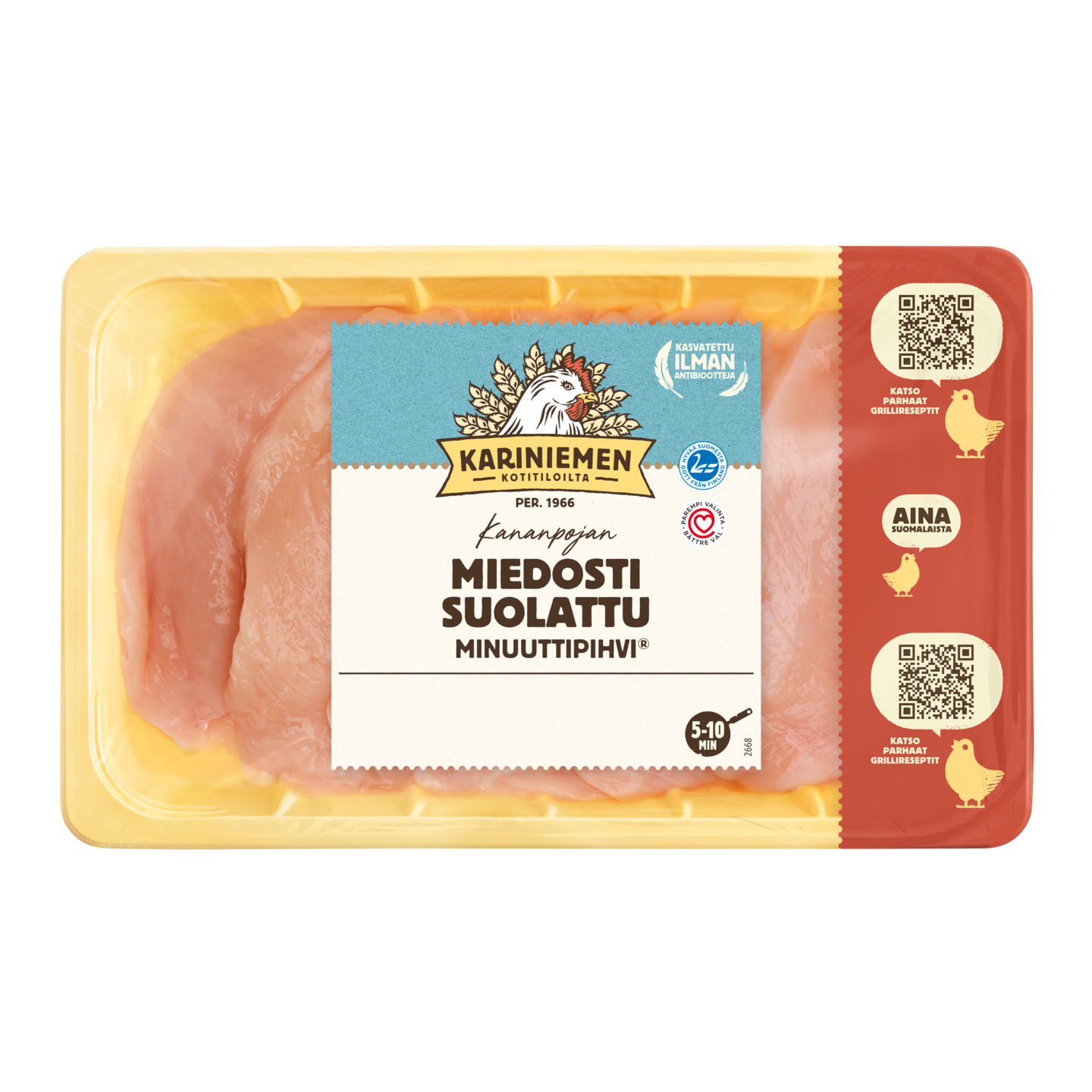 Kariniemen Kananpojan Minuuttipihvi miedosti suolattu on ohut, fileestä valmistettu pihvi. Mieto suolaus pitää pihvit kypsennettäessä mehevämpänä. Minuuttipihvi sopii moniin kanaruokiin, esimerkiksi pasta-annoksiin, salaatteihin ja on herkullinen myös grillattuna. Rasiassa on 6-8 pihviä. Kariniemen Kananpoika on aina suomalaista, ilman antibiootteja kasvatettua kanaa.