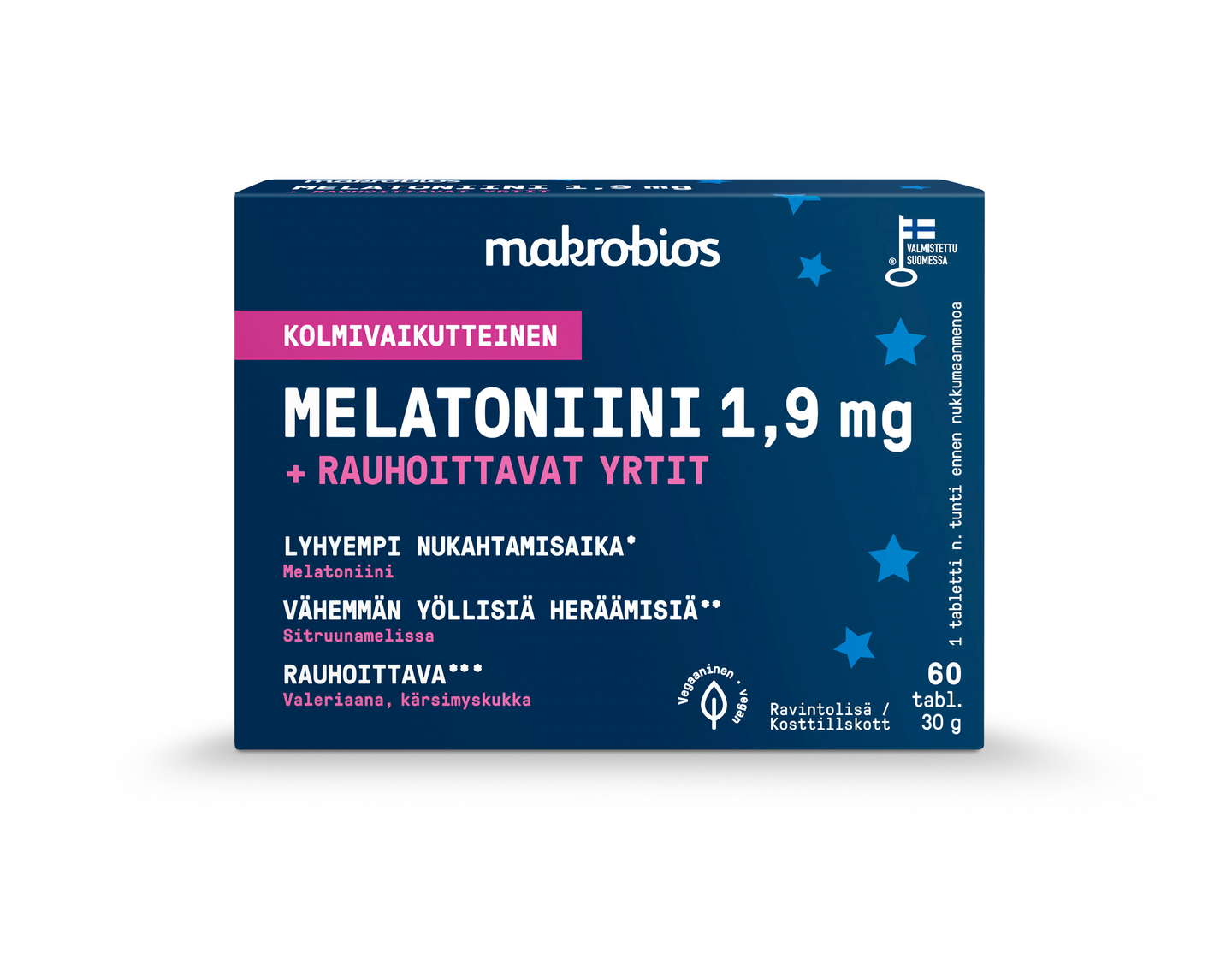 Melatoniini auttaa lyhentämään nukahtamisaikaa*. Sitruunamelissa auttaa ylläpitämään unta**. Valeriaana ja kärsimyskukka auttavat rauhoittumaan***. Edullinen vaikutus saavutetaan nauttimalla 1 mg melatoniinia lähellä nukkumaanmenoaikaa.Valmistettu Suomessa.