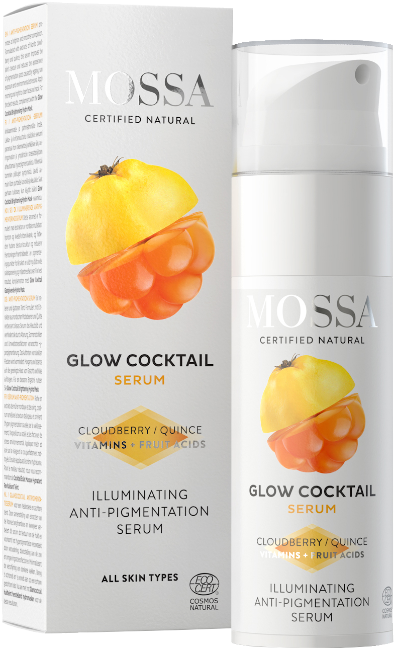 Mossa Glow Cocktail pigmenttimuutoksia ehkäisevä seerumi kirkastaa ihoa ja tasoittaa ihon sävyä pohjoisen hillan ja kvittenin uutteilla. Parantaa ihon rakennetta ja ehkäisee ikääntymisen, auringon ja ilmansaasteiden aiheuttamia ihon pigmenttimuutoksia.