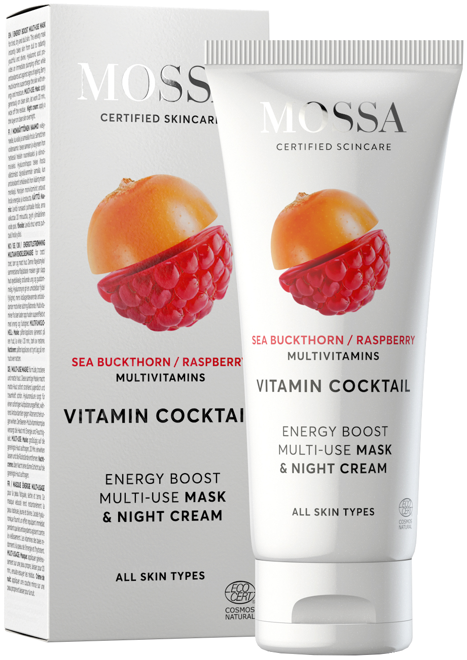 Mossa-sarjan Vitamin Cocktail Energy Boost Multi-use Mask on nimensä mukaisesti monivaikutteinen mahtivoide, jossa naamioiden tehokas hoitavuus ja yövoiteiden uudistavat vaikutukset paiskaavat menestyksekkäästi kättä! Ei ollenkaan suottaa innovatiiviseksi ihonhoitotuotteeksi kehuttu Mossan Vitamin cocktail naamio & yövoide ravitsee ihosi entistäkin ihanammaksi tehokkaasti ja hellävaraisesti.