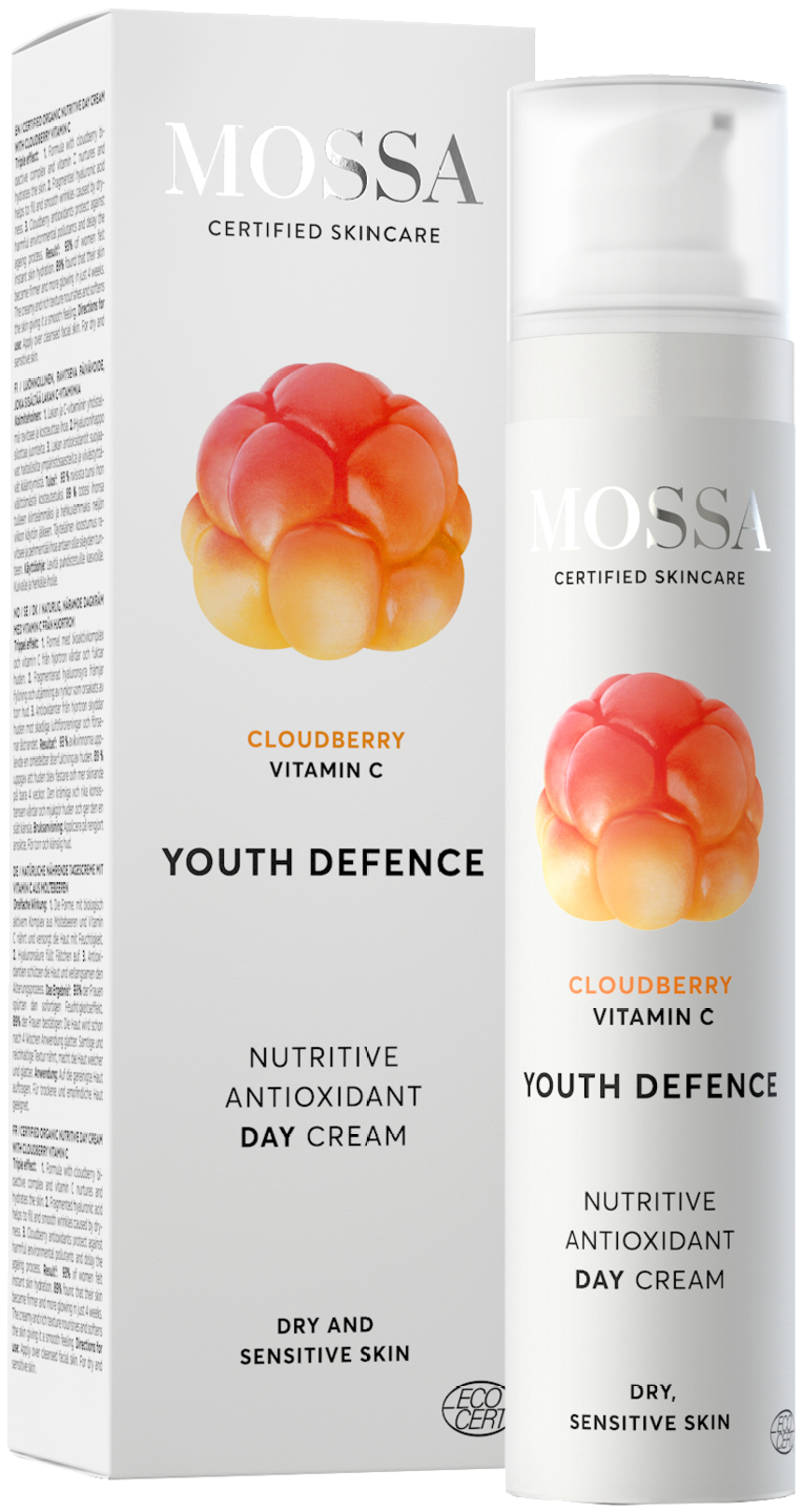Mossan Youth Defence -linjan lakka-päivävoide tasoittaa ihon sävyä, suojaa sitä ilmansaasteiden haitalliselta vaikutukselta ja kosteuttaa syvältä. Lakka sisältää paljon C-vitamiinia, jota pidetään kirkkaan ja heleän ihon yhtenä kulmakivenä. C-vitamiini on vahva antioksidantti ja se vahvistaa ihon omaa suojamekanismia, jolloin iho kestää paremmin ulkoiset rasituksen, kuten kuivan ilman, saasteet, vaihtelevan ilmaston ja UV-säteet. C-vitamiini neutraloi myös jo aiheutuneita haittoja. Youth Defence -linjan tuotteet on kehitetty 20-35 vuotiaalle iholle ja niissä on kevyt anti age – vaikutus.