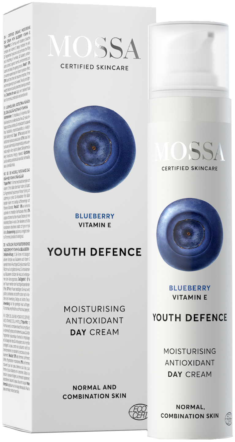 Mossan Youth Defence -linjan mustikka-päivävoide tasoittaa ihon sävyn ja suojaa sitä ulkoisilta haittavaikutuksilta, kuten ilmansaasteilta ja UV-säteiltä. Mustikan E-vitamiini ja hyaluronihappo syväkosteuttavat ihoa, ja antioksidantit suojaavat ihoa ympäristösaasteilta viivästyttäen ikääntymistä. Youth Defence -linjan tuotteet on kehitetty 20-35 vuotiaalle iholle ja niissä on kevyt anti age – vaikutus. E-vitamiini stimuloi solujen kollageenituotantoa ja lisäten ihon kimmoisuutta tehden siitä täyteläisen. Hyaluronihappo syväkosteuttaa ja tasoittaa ihon pintaa. Ihosta tulee luonnollisen kaunis, heleä ja kimmoisa.
