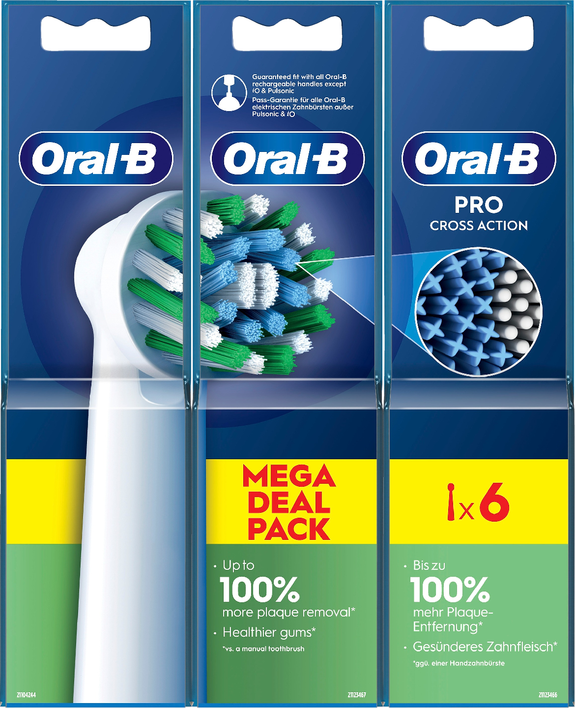 Oral-B Pro Cross Action -harjaspään yli 2 200 täydelliseen kulmaan asetettua harjasta poistaa jopa 100 % enemmän plakkia, jotta saat puhtaammat hampaat ja terveemmät ikenet verrattuna käsikäyttöiseen hammasharjaan. Aidoissa Oral-B-harjaspäissä on uudet X:n muotoiset harjakset, jotka puhdistavat alueet, joihin pyöreät harjakset eivät yllä. Harjaspään kulumisen ilmaisin muuttaa harjakset vihreästä keltaiseksi, kun on aika vaihtaa harjaspää, mikä takaa aina 100 % puhdistustehon. Yhteensopiva ladattavien Oral-B-sähköhammasharjojen kanssa Pulsonic- & iO-sähköhammasharjoja lukuun ottamatta.
