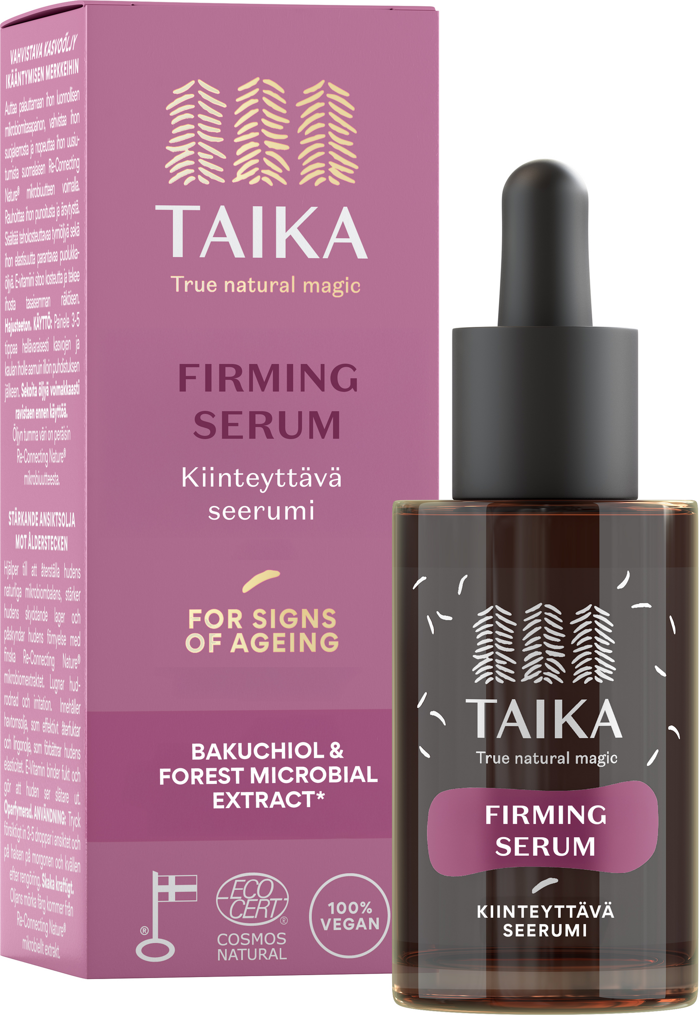 Kasvoseerumi kiinteyttää, vahvistaa ja vähentää punoitusta samalla tasoittaen ja kirkastaen ihoa. Kevyt ja nopeasti imeytyvä, hajusteeton koostumus sopii erityisesti ikääntyvälle iholle. Bakuchiol lisää kollageenin tuotantoa ja stimuloi solujen uusiutumista, auttaen näin kiinteyttämään ihoa ja vähentämään ikääntymisen merkkejä. Re-connecting Nature® -uute tasapainottaa ihon omaa mikrobiomia, nopeuttaa ihon uusiutumista ja vähentää punoitusta. Puolukan siemenöljy kirkastaa ja tasoittaa ihon sävyä, tuoden iholle heleyttä. Käyttö: Levitä kasvojen ja kaulan iholle aamuin illoin puhdistuksen jälkeen ja tunne ihollasi luonnon taika. Jatka ihonhoitorutiiniasi Taika Kiinteyttävällä kasvovoiteella.