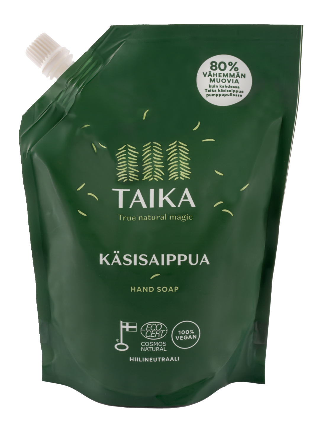 Raikkaantuoksuinen Taika Käsisaippua pesee hellävaraisesti ja tehokkaasti, jättämättä ihoa kuivan tuntuiseksi. Glyseriini ja manteliöljy kosteuttavat ihoa, tehden saippuasta täydellisen valinnan päivittäiseen käyttöön. Kahden täyttökerran kätevä täyttöpussi tarjoaa käytännöllisen ja ympäristöystävällisemmän vaihtoehdon koko perheelle. Vegaaninen, Ecocert Cosmos Natural -sertifioitu luonnonkosmetiikkatuote, joka sopii kaikille ihotyypeille. Valmistettu Suomessa.