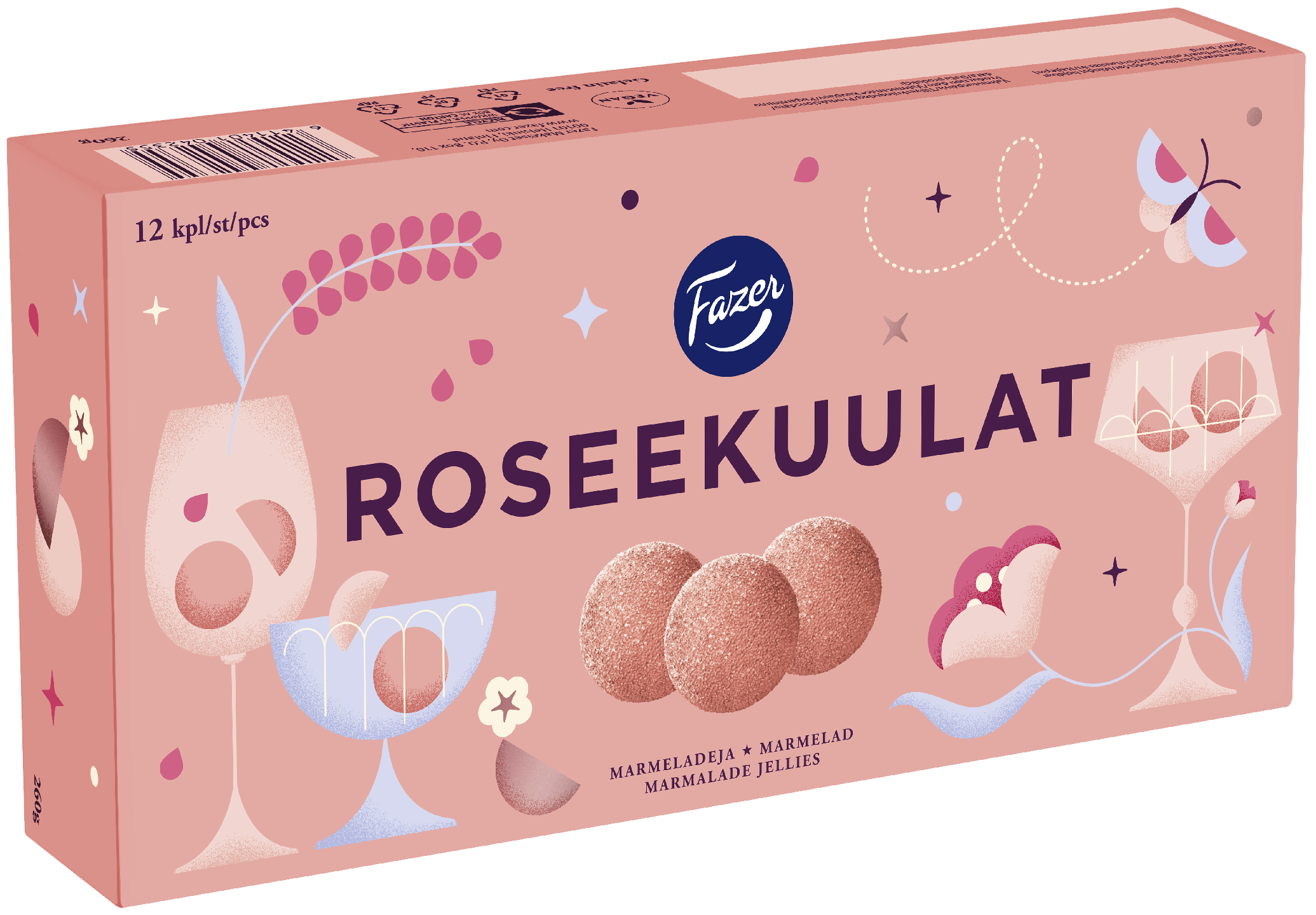 Fazer Roseekuulat hurmaavat kepeän raikkaalla maullaan. Kauniit Roseekuulat on ilo laittaa esille, kun on juhlan aika. Marmeladikuulat eivät sisällä gluteenia, liivatetta tai laktoosia ja sopivat myös vegaaneille. Alkoholittomia. Vinkki: viilennä skumppalasisi pakastetulla Roseekuulalla!