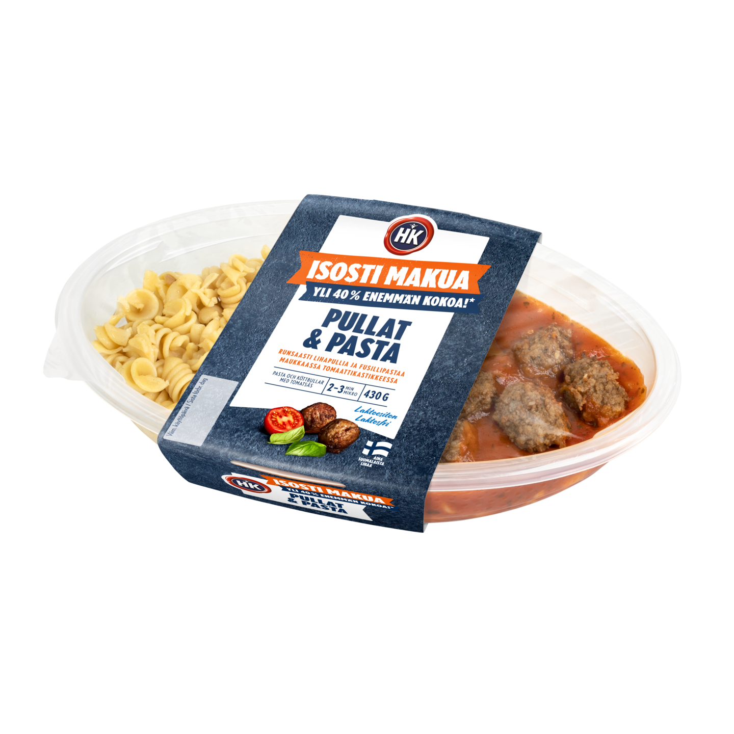 HK Isosti makua -mikroaterioissa on runsaasti haarukoitavaa. Lihapullapasta-ateriamme sisältää runsaan annoksen lihapullia suomalaisesta lihasta, herkullisen tomaattikastikkeen ja laadukkaan fusilli-pastan kera. Mikrovalmis annosateria lämpenee mikrossa muutamassa minuutissa ja annoksen voi nauttia pakkauksestaan. Täydennä annosta mieleisillä kasviksilla. Isosti makua -valmisateriat valmistamme Suomessa, aina suomalaisesta lihasta. Lajittele pakkaus ruokailun jälkeen muovina ja kartonkina.