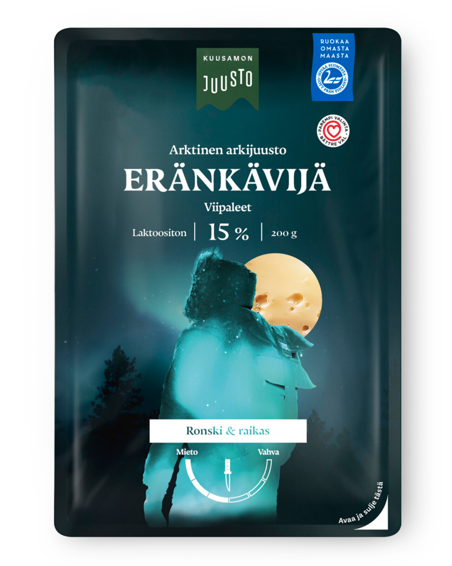 Eränkävijä® 15% on ronski ja raikas, jokaiselle maistuva arktinen arkijuusto. Sydänmerkki-tuote on parempi valinta. Kätevät viipaleet sopivat leivälle ja ruoanlaittoon. Kuusamon Juuston Eränkävijä® 15% on laktoositon juusto, joka sisältää runsaasti kalsiumia.