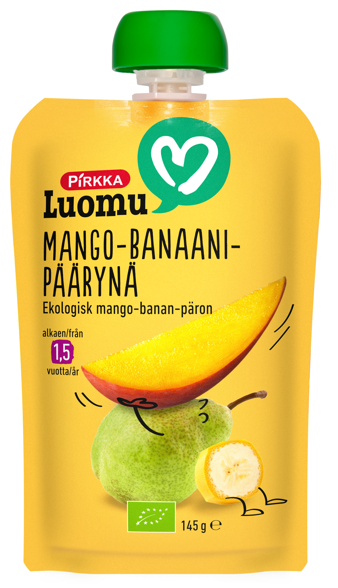 Pirkka Ekologisk mango-banan-pärönpuré är ett snabbt och enkelt mellanmål från 1,5 års ålder och uppåt, antingen som det är eller tillsammans med yoghurt, gröt, fil eller kvarg. Produkten innehåller endast ekologiskt odlade frukt, utan tillsatt socker. Praktisk påse med kork som kan förvaras i rumstemperatur.