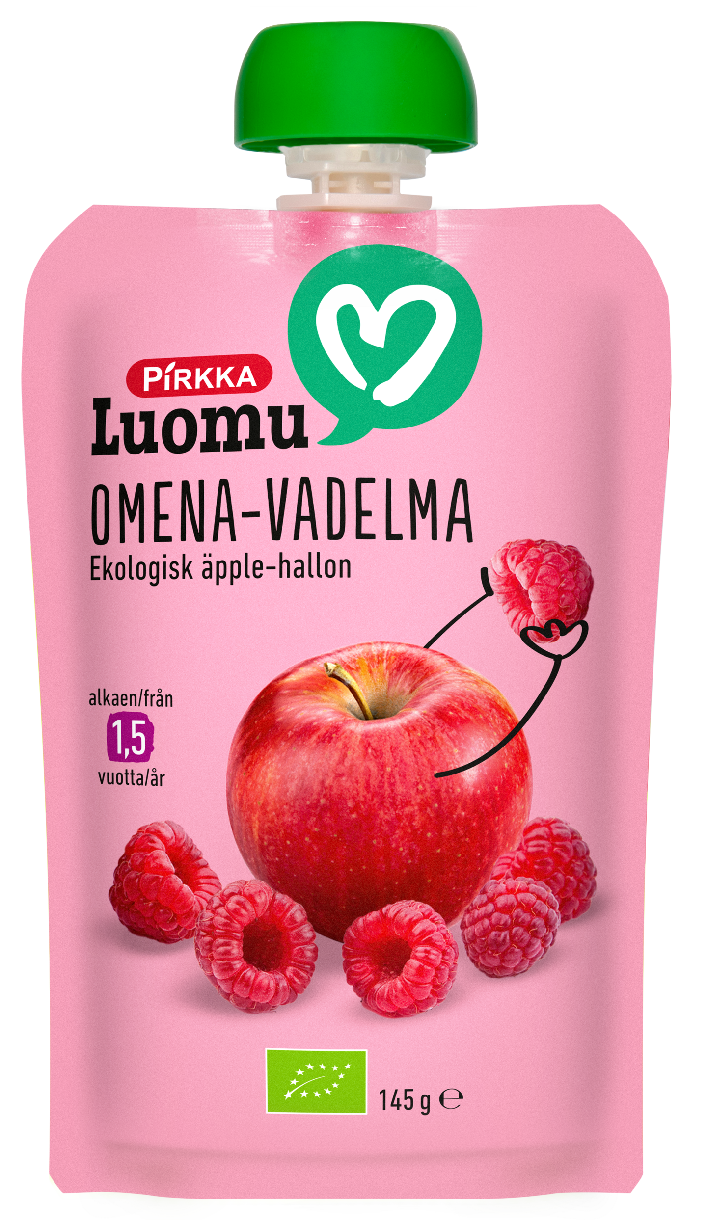 Pirkka Luomu omena-vadelmasose sopii tarjottavaksi nopeana ja helppona välipalana 1,5 vuotiaasta alkaen sellaisenaan tai esimerkiksi jogurtin, puuron, viilin tai rahkan kanssa tarjottuna. Tuote sisältää vain luonnonmukaisesti viljeltyä hedelmää ja marjaa, ei lisättyä sokeria. Kätevä korkillinen pussipakkaus, joka säilyy huoneenlämmössä.