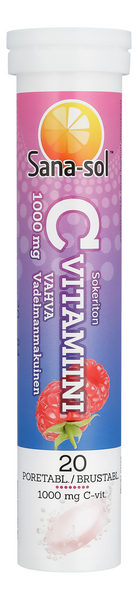 Sana-sol C-vitamiini on vadelmanmakuinen vahva 1000 mg C-porevitamiini. C-vitamiini edistää immuunijärjestelmän normaalia toimintaa ja solujen suojaamista hapettumisstressiltä. 1 poretabletti päivässä, liuotetaan lasilliseen vettä. Ravintolisä ei korvaa monipuolista ja tasapainoista ruokavaliota eikä terveitä elämäntapoja.