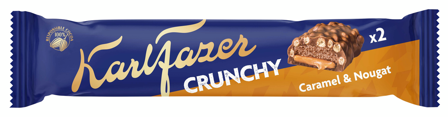 Karl Fazer Crunchy -suklaapatukassa maistuu herkullinen toffee ja pehmeä hasselpähkinänougat. Patukka on kuorrutettu suolaisilla vehnämuroilla ja aidolla Fazer maitosuklaalla - täydellinen yhdistelmä rouskuvaa energiaa ja nautintoa, joka taltuttaa isommankin makean nälän. Pakkauksessa on kaksi isoa palaa. Suomen rakastetuin suklaa, jonka ainutlaatuisen täyteläisen maun ovat taanneet parhaat raaka-aineet jo vuodesta 1922 saakka. Noudatamme kaakaonhankinnassamme Fazerin kaakaovisiota. Lue lisää www.fazercocoavision.com. Maista, ihastu ja nauti!
