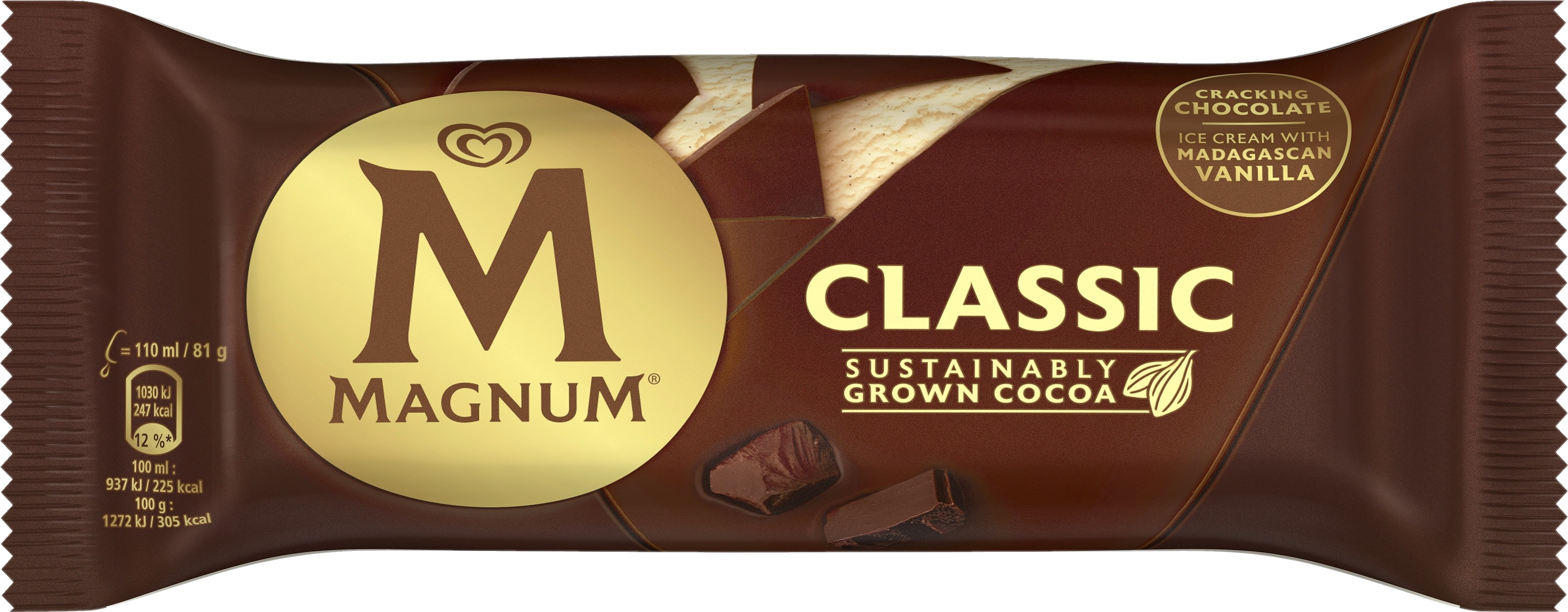 Maista ja ihastu, koe samettisen pehmeän jäätelön ja lohkeavan Magnum-suklaan täyteläinen liitto. Magnum on jäätelö, joka tarjoaa puhdasta nautintoa ja aistillisia hetkiä. Magnum Classic -jäätelöpuikkoa ympäröi ylellinen kerros Magnum-suklaata. Nauti täyteläisestä suklaakuorrutteesta ja Madagaskarin vaniljalla maustetusta jäätelöstä. Magnum tuo nostetta elämään ja kohottaa tavalliset hetket arjen yläpuolelle. Magnum Classic -jäätelö tarjoaa ainutlaatuisen nautinnon ja luvan olla hieman vallaton. Uskomme, että päivä ilman nautintoa on hukkaan heitetty päivä, koska ilo ja nautinto tekevät elämästä elämisen arvoista. Yksityiskohdat ovat tärkeitä. Asiantuntijoitamme motivoi intohimo, tarkkuus ja rakkaus jäätelöön. Käytämme tuotteissamme vain huolella valittuja raaka-aineita. Tiivis yhteistyömme Rainforest Alliancen kanssa varmistaa sen, että kaikki kaakaopapumme tuotetaan vastuullisesti – niillä on edessään pitkä matka ennen kuin niistä tulee Magnum-suklaata. Kyse on laadusta ja kestävästä toiminnasta koko matkan ajan. Magnum rohkaisee kaikkia tarttumaan hetkeen ja hemmottelemaan itseään pienellä ylellisyydellä. Vuodesta 1989 lähtien nautiskelijat ympäri maailmaa ovat saaneet nauttia poikkeuksellisesta suklaa- ja jäätelökokemuksesta. Valittavana on monipuolinen valikoima erilaisia makuja ja vegaanijäätelövalikoimaamme. Magnum tarjoaa jokaiselle jotakin. Mikä jäätelömaku on sinun suosikkisi? Älä unohda, että kun haluat pitää jäätelösi aina yhtä hyvänä, tulee se säilyttää -18 °C:ssa tai kylmemmässä parhaan jäätelönautinnon saavuttamiseksi. Kun jokaiseen yksityiskohtaan paneudutaan äärimmäisellä huolellisuudella, lopputuloksena on jotain ainutlaatuista. Sellaista kuin Magnum. Tutustu kaikkiin Magnum-jäätelöihin ja löydä kokonainen nautintojen maailma.
