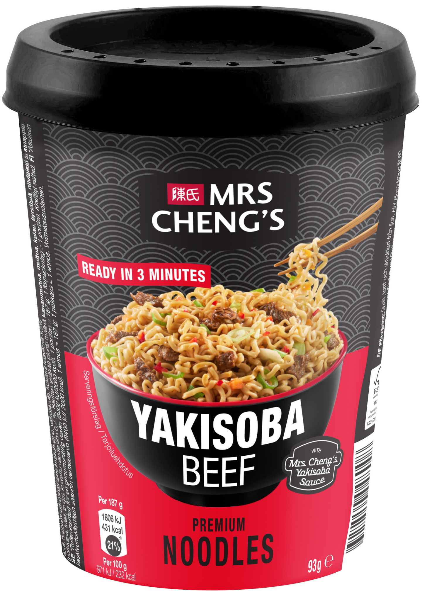 Mrs Cheng's Yakisoba naudanmakuinen kuppinuudeli yhdistää ensiluokkaisen laadun ja aidot aasialaiset maut. Maukas ateria on helppo ja nopea valmistaa 3 minuutissa. Kaada kiehuvaa vettä kuppiin nuudelien, naudan ja vihannesten päälle, minkä jälkeen odota kolme minuuttia. Kaada vesi pois kupista ja lisää Mrs Cheng's kastike nuudelien päälle koko ajan sekoittaen. Kun vesi on kaadettu pois, sekoittuu nestemäinen Yakisoba-kastike tasaisesti antaen nuudeleille täyteläisen maun. Valmis ateriakokonaisuus on helppo syödä siististi ilman roiskeita. Kätevän kupin ansiosta Mrs Cheng’s pikanuudelit sopivat täydellisesti mukaan otettavaksi välipalaksi kouluun, työpaikalle ja harrastuksiin tai nopeaksi ateriaksi kiireisen päivän päätteeksi. Mrs Cheng's nuudelit sopivat erinomaisesti myös ruuanlaittoon keittojen, wokkiruokien ja salaattien kanssa. Valitse suosikkimakusi laadukkaista Mrs Cheng's nuudeleista: kana, kasvis ja nauta, jotka on valmistettu Euroopassa. Katso lisää inspiraatiota sekä aasialaisia reseptejä verkkosivuiltamme mrschengs.fi