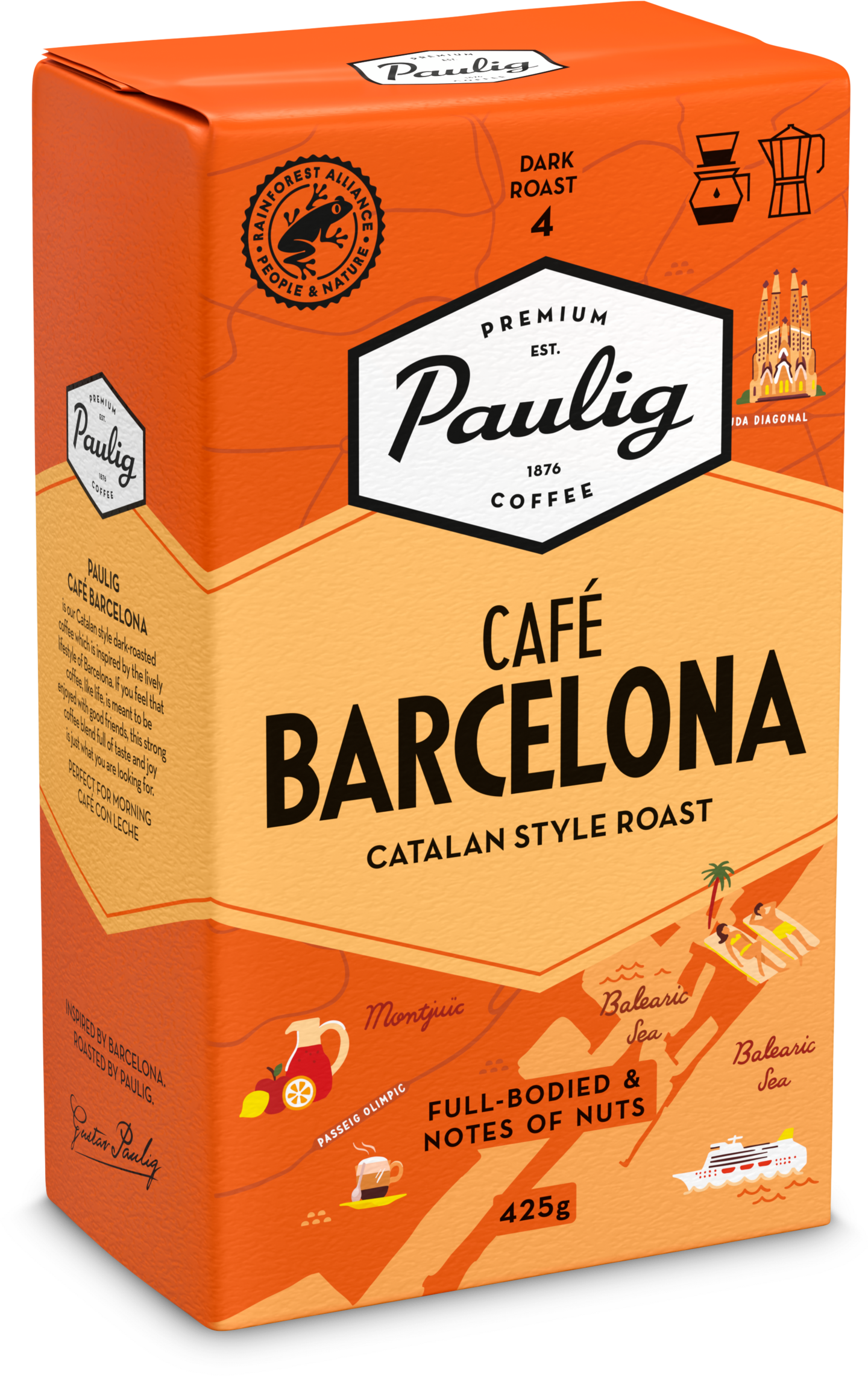 Paulig Café Barcelona on täyteläinen tummapaahto, joka vie ajatukset Välimeren lämpöön ja kiireettömiin iltapäivän kahvihetkiin. Suodatinkahvisekoituksen tumman kahvin maku on hersyvä, tumman paahteinen ja siinä on pähkinäsuklaisia vivahteita. Paulig Café Barcelona kahvi on Pauligin kaupunkikahvi, joka on saanut inspiraationsa Barcelonan eläväisestä kaupunkitunnelmasta, jossa iltapäivän kahvihetkelle otetaan aikaa ja siitä nautitaan kaikin aistein. Paulig Café Barcelona kahviin vivahteikkuutta tuovat Etelä-Amerikan kahvilaadut sekä ryhdikkyyttä intialainen robusta. Paahtoaste 4. Rainforest Alliance -sertifioitu. Lisätietoa: ra.org. • Tummapaahtoinen (4/5), täyteläinen suodatinkahvi pähkinäsuklaisilla vivahteilla • Nauti virkistävänä iltapäiväkahvina tai kiireettömästi ystävien seurassa • Valmistus suodatinmenetelmällä tai mutteripannulla