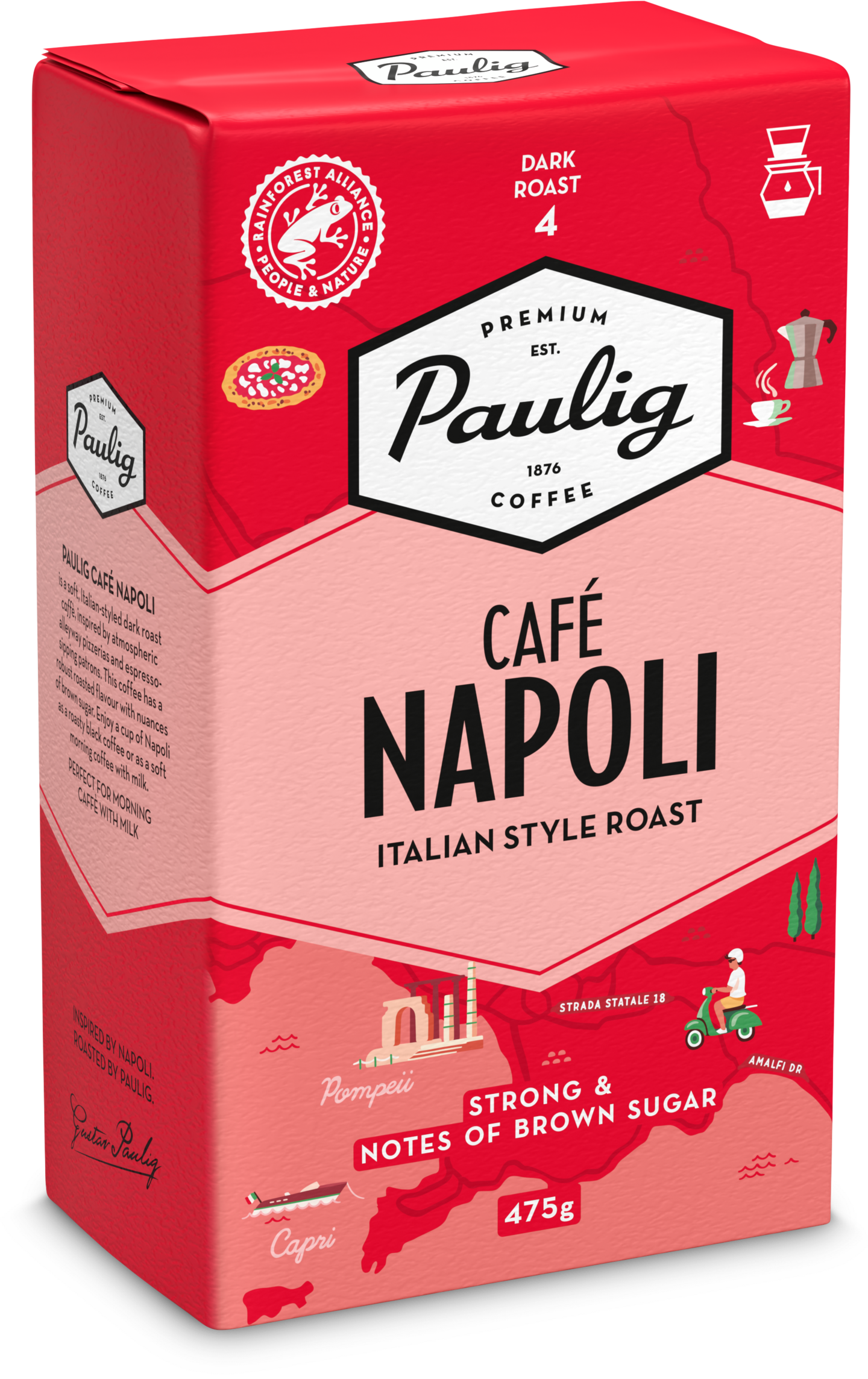 Paulig Café Napoli on italialaiseen tyyliin tummapaahtoinen ja pehmeä suodatinkahvi, joka on inspiroitunut tunnelmallisten kujien pizzerioista ja niiden espressoa nauttivista vieraista. Kahvin mausta voit löytää rotevaa paahteisuutta ja tumman sokerin vivahteita. Nauti kuppi Napolia mustana kahvina tai pehmeänä aamukahvina maidon kera. Paahtoaste 4. Rainforest Alliance -sertifioitu. Lisätietoa: ra.org. • Tummapaahto (4/5), jossa on tumman sokerin vivahteita • Nauti mustana tai pehmeänä aamukahvina maidon kera • Valmistus suodatinmenetelmällä