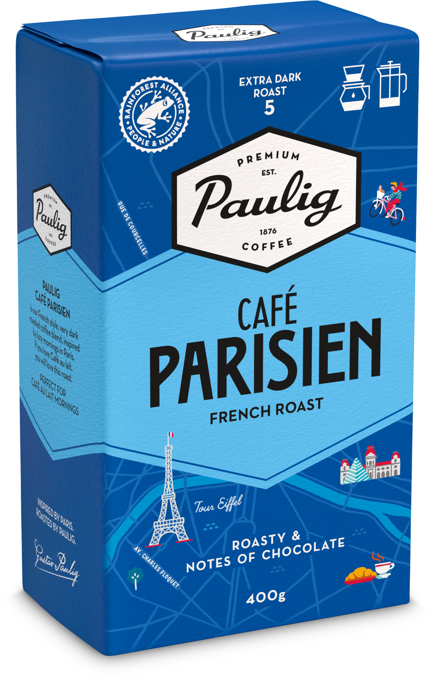 Paulig Café Parisien on erittäin tumma ranskalaistyyppinen suodatinkahvi suklaisilla vivahteilla. Pauligin Kaupunkikahvien sarjaan kuuluva Paulig Café Parisien kahvi on saanut inspiraationsa pariisilaisesta kahvikulttuurista ja ranskalaiseen tapaan Café Parisien on paahdettu erittäin tummaksi. Paulig Café Parisien kahvi sopii erinomaisesti kiireettömien aamujen Café au lait -maitokahviksi. Tummapaahtoisen kahvin ystävät pitävät siitä myös sellaisenaan suodatinmenetelmällä tai pressopannulla valmistettuna. Paulig Café Parisien hienojauhettu kahvi sopii makupariksi erityisesti suolaisille leivonnaisille, kuten croissantille, sekä vähemmän makeille leivonnaisille. Kahvisekoituksessa on Rainforest Alliance -sertifioituja kahvipapuja Etelä- ja Keski-Amerikan lisäksi Afrikasta ja Intiasta. Afrikkalaiset kahvipavut tuovat Paulig Cafe Parisien kahviin marjaisuutta, ja pieni siivu intialaista robustaa tasapainoittaa kahvin makua. Paahtoaste 5. Rainforest Alliance -sertifioitu. Lisätietoa: ra.org. • Erittäin tummapaahtoinen (5/5) ranskalaistyyppinen suodatinkahvi suklaisilla vivahteilla • Parhaimmillaan aamulla Café au lait -maitokahvina suolaisten leivonnaisten kanssa • Valmistus suodatinmenetelmällä tai pressopannulla