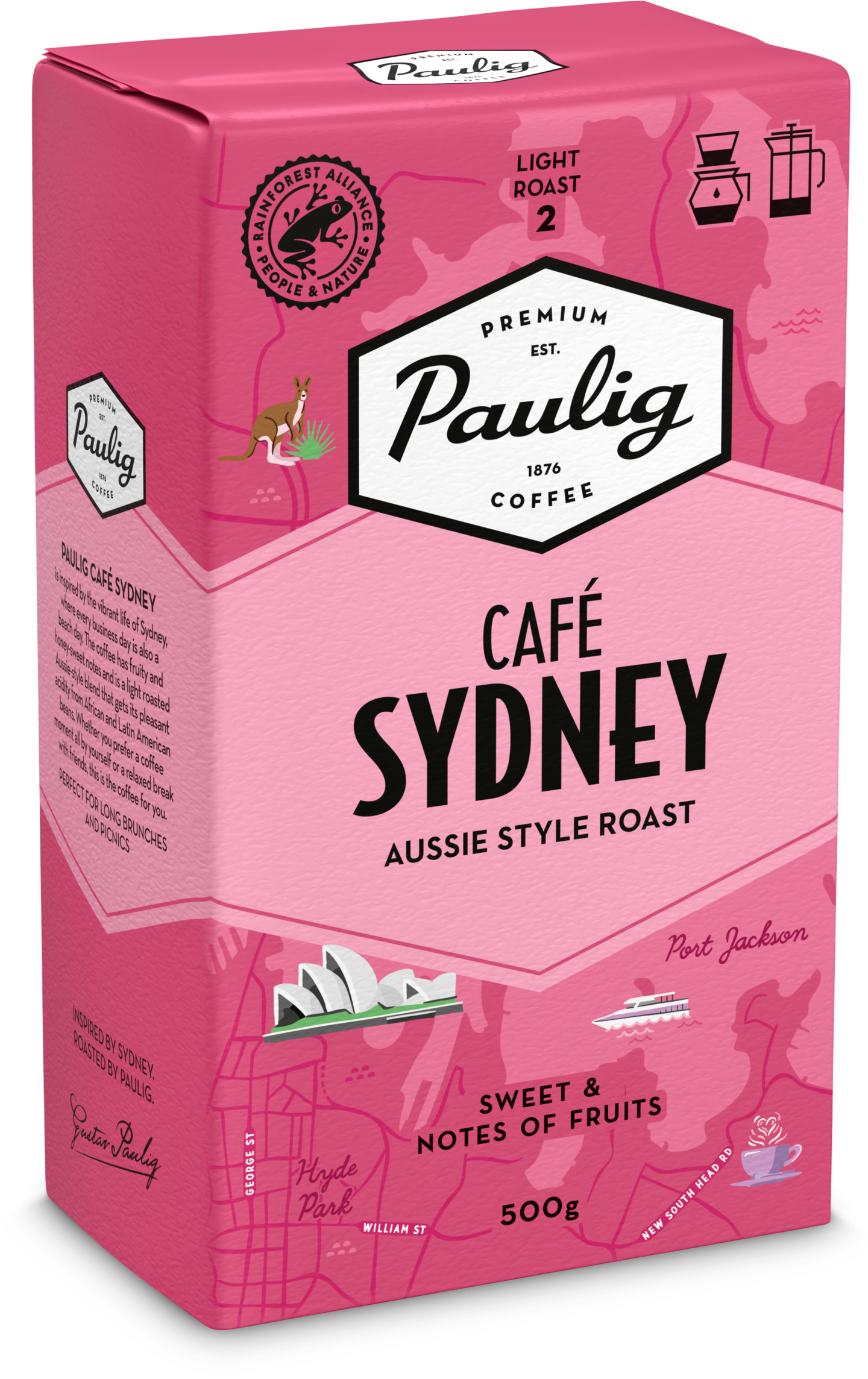 Paulig Café Sydney on vaaleapaahtoinen ja miellyttävän hapokas suodatinkahvi omaan kahvihetkeesi tai rennosti ja kiireettömästi ystävien seurassa nautittavaksi. Kahvisekoituksen maku on hedelmäisen vivahteikas ja hunajaisen makea. Paulig Café Sydney kahvi on Pauligin kaupunkikahvi, joka on saanut inspiraationsa letkeästä australialaisesta elämäntyylistä, jossa kahvi kuuluu niin aamujen aamiaistarjoiluihin, ulkona nautittuihin picnic- ja BBQ-retkiin sekä fine dining -illallisiin. Paulig Café Sydney kahvi on sekoitus afrikkalaisia ja Latinalaisen Amerikan arabica-kahvipapuja. Tämä kahvi sopii erityisen hyvin valmistettavaksi pour over -käsinsuodatusmenetelmällä. Paahtoaste 2. Rainforest Alliance -sertifioitu. Lisätietoa: ra.org. • Vaaleapaahtoinen (2/5) ja hunajaisen makea suodatinkahvi • Nauti avokadoleivän tai smoothie bowlin kanssa All Day Breakfast -tyyliin • Valmistus suodatinmenetelmällä, pressopannulla tai pour over -käsinsuodatusmenetelmällä.