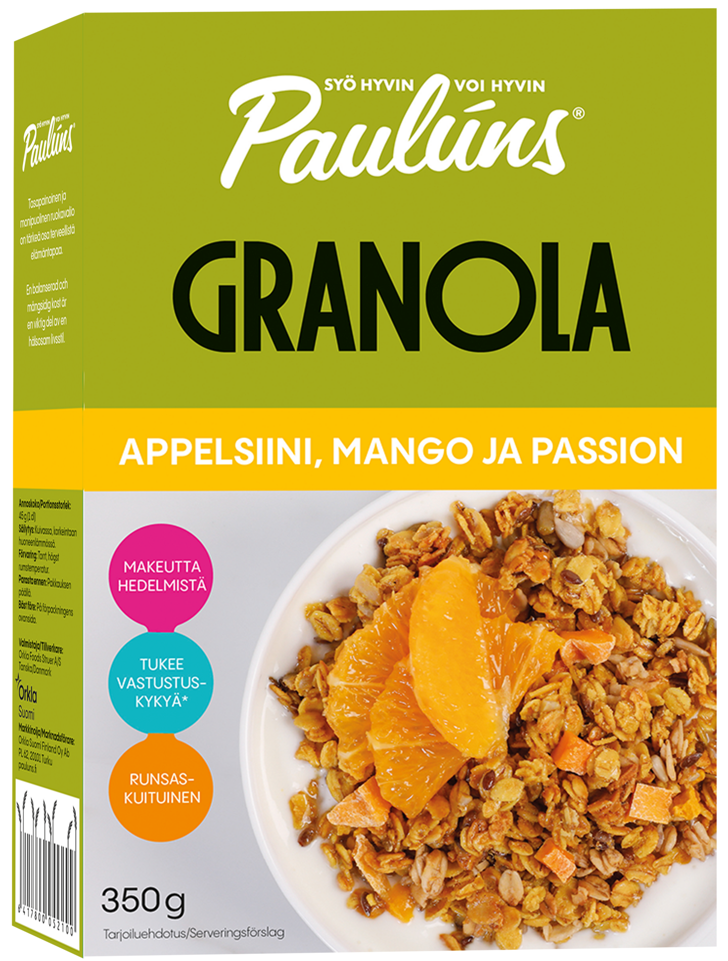 Paulúns® appelsiini-mango-passion granolan maku on raikas ja hedelmäinen. Tuttu appelsiini, eksoottinen mango ja pirteä passion on uusi, herkullinen makuyhdistelmä. Makuelämyksen täydentää kullankeltaiseksi paahdettu, rapea kauragranola, sekä siemenet ja huolellisesti valitut mausteet, kuten inkivääri ja kurkuma. Paulúns appelsiini-mango-passion -granola tukee vastustuskykyä, sillä granola sisältää rautaa, sinkkiä ja kuparia, jotka edistävät immuunijärjestelmän normaalia toimintaa. Paulúns-tuotteet saavat makeutta hedelmistä, aina ilman lisäaineita. Paulúns - syö hyvin, voi hyvin®.