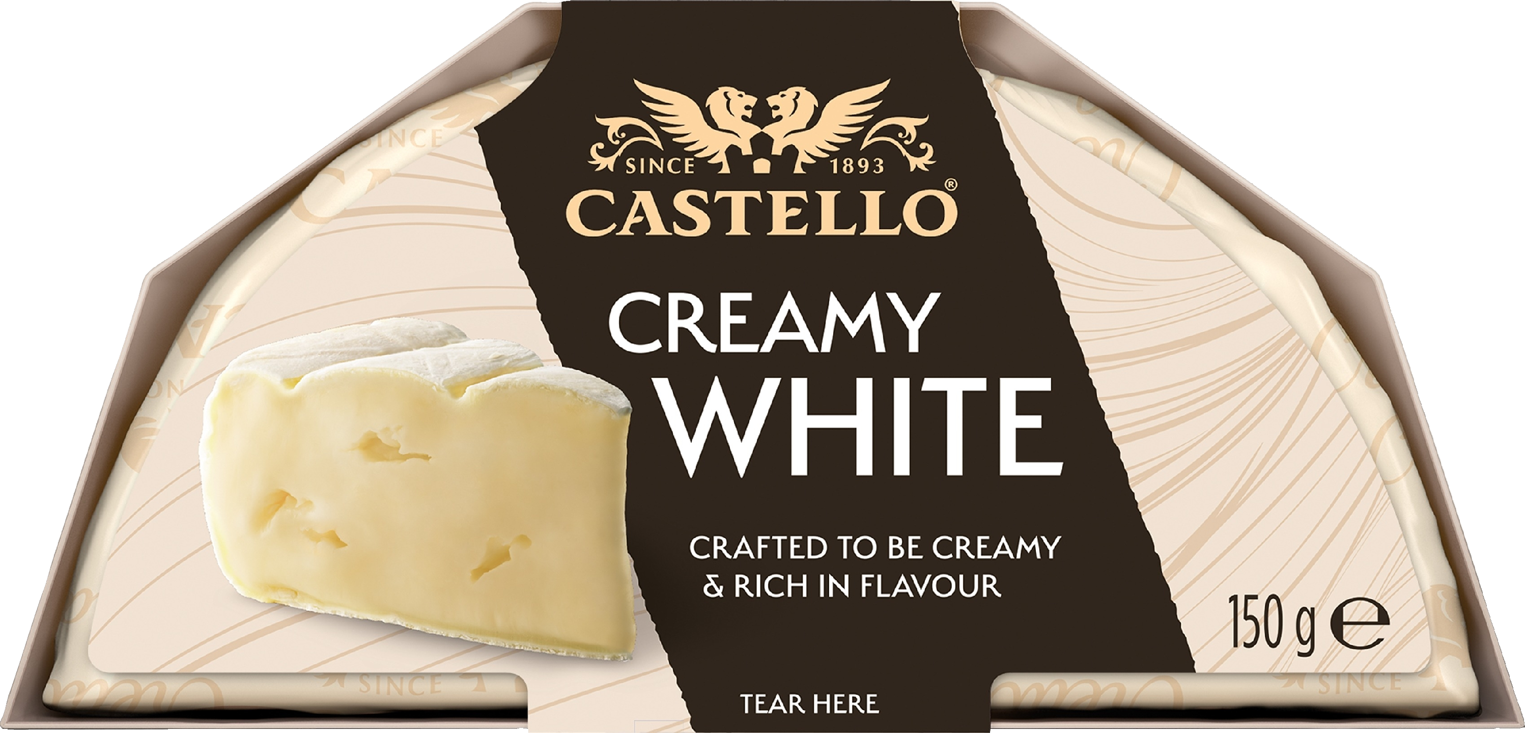 Castello White on kauttaaltaan täyteläisen kermainen brie-tyylinen valkohomejuusto. Hento ja hieno homehuntu, täydellinen suutuntuma. Pehmeä, runsasrasvainen, pinnalta ja sisältä homekypsytetty. Laktoositon. Voimakassuolainen.