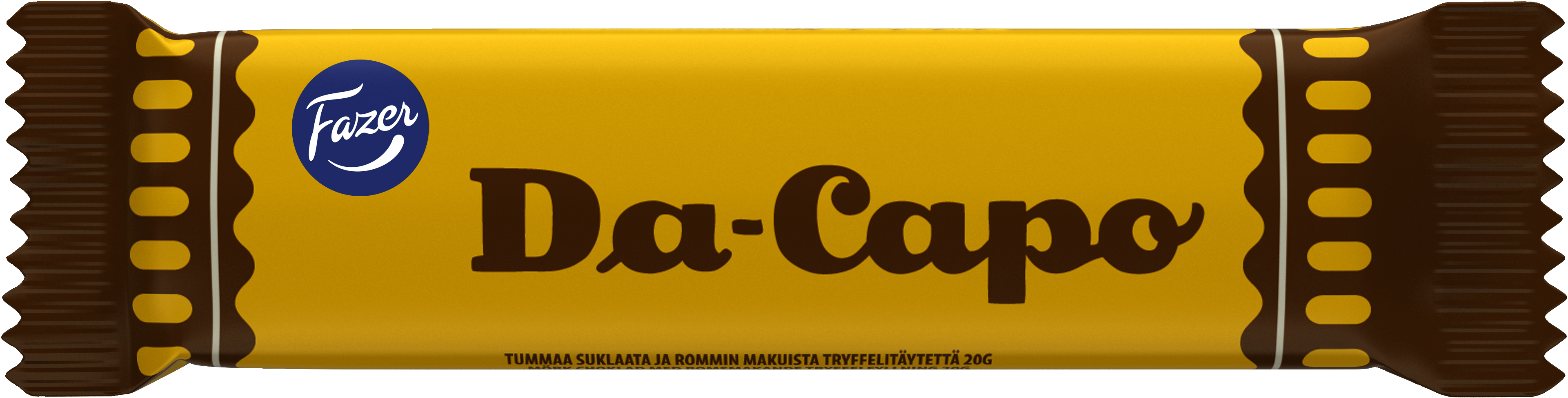 Fazerin ensimmäinen suklaapatukka Da Capo on yli satavuotias klassikko, jota vuodet eivät paina. Tumman suklaan ja rommitryffelitäytteen täydellinen liitto maistuu täyteläisessä pikkupatukassa. Noudatamme kaakaonhankinnassamme Fazerin kaakaovisiota. Lue lisää www.fazercocoavision.com. Patukka on pieni herkku päivän piristykseksi!
