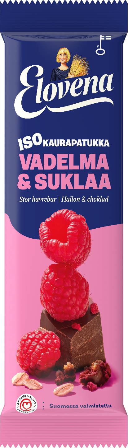 Elovena Iso kaurapatukka Vadelma & suklaa on kertakaikkisen kiehtova välipalapatukkauutuus! Rouhean herkku rakenne, suussa sulava kuorrute ja rouskuvat ripotteet yhdessä valloittavan vadelman ja tumman suklaan kanssa nostavat hymynkareen huulille arkisenakin välipalahetkenä. Kuten täysi elo, niin myös tämä runsaskuituinen patukka on ihan sitä tuttua kauraa. Aivan kuten onnen salaisuus piilee arjen paloissa ja pienissä murusissa, kaikki kaurapatukan murut ja kimpaleet ovat huolella valittuja. Tuote on leivottu Suomessa suomalaisesta kaurasta. Kaakao on Rainforest Alliance -sertifioitu eikä tuote sisällä palmuöljyä tai ylenpalttisesti makeutta. Nappaa kätevä yksittäispakattu patukka ostoskassiin ja varaudu makoisaan herkkuhetkeen päivän menojen välissä.
