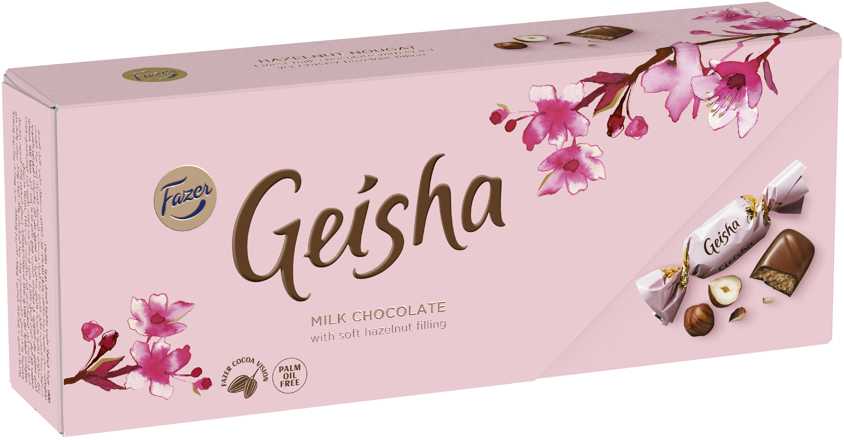 Geishan pehmeä maitosuklaa kätkee sisäänsä hasselpähkinänougat-täytteen. Herkullisten Geisha-konvehtien maitosuklaakuoren sisällä odottaa pehmeän rapea täyte. Inspiroidu rauhasta ja tarjoa ystäville hetki yhteistä aikaa. Kaunis rasia on myös lahja, joka muistetaan. Noudatamme kaakaonhankinnassamme Fazerin kaakaovisiota. Lue lisää www.fazercocoavision.com.